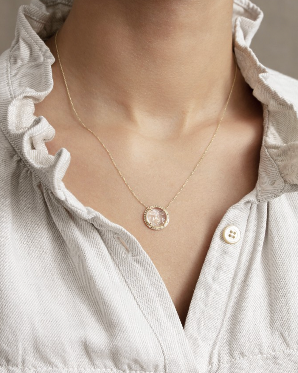 Poetic engraved rock cristal as a moon face, set with diamonds, on a fine 14 karat gold chain. 44.5 cm length chain.
