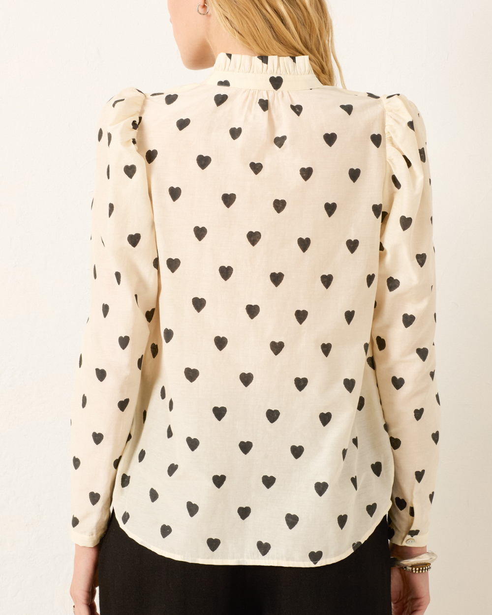 Individually cut by hand, this cotton-silk blend shirt has tapered puff sleeves, a ruffled collar, and a mother-of-pearl button front. The vintage-inspired shirt is hand-block printed with a heart motif and finished with French seams.