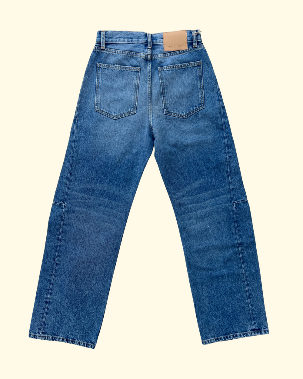 High rise fit sitting at the natural waist with a cropped inseam. Relaxed fit through the hips with an articulated slim bowed leg shape.