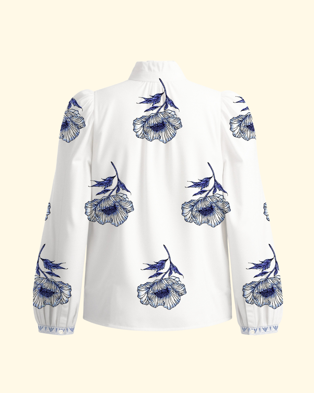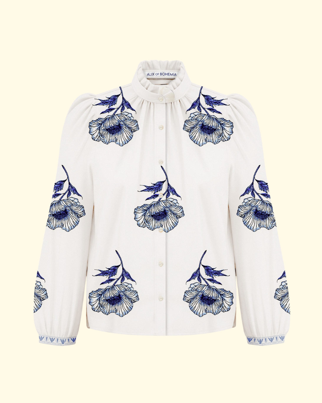 Inspired by a '70s silhouette, the Annabel has puff shoulders and a feminine ruffled collar. The cotton-silk blend shirt is hand-block-printed with a detailed poppy motif.