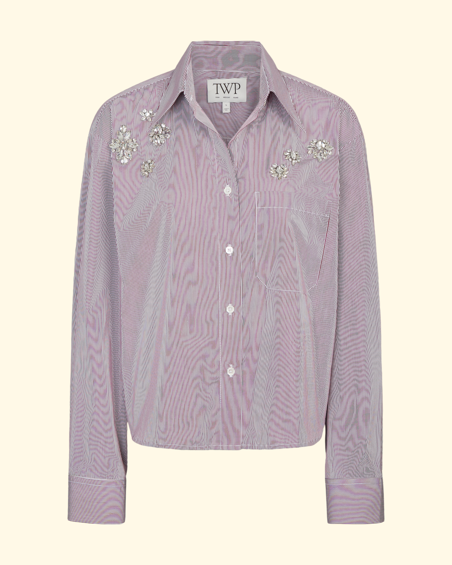 Slightly cropped long-sleeve button-up in superfine Italian cotton shirting with a mini stripe. The J.D. has a boxy fit with a curved hem and a box pleat at the back. Finished with hand-applied crystal embellishment at the shoulder, a chest patch pocket, point collar, and signature single roll button cuffs.