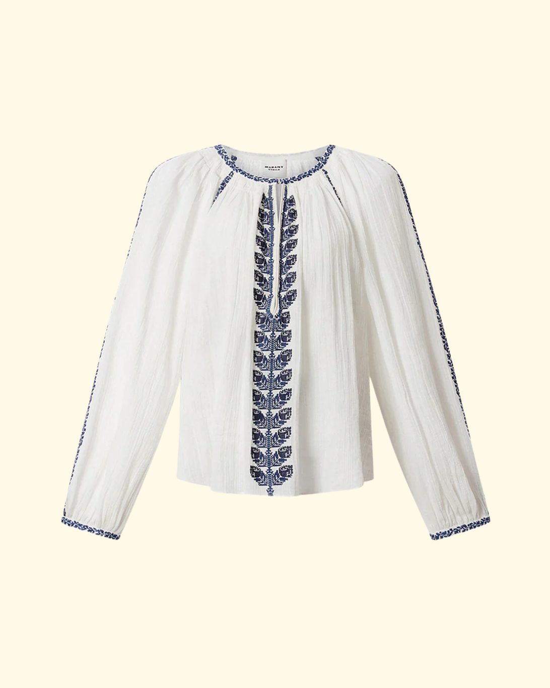 Marant Étoile's Lena is a tunic style embroidered lightweight cotton blouse. Round neckline with teardrop-shaped opening and hook and long raglan sleeves with tapered cuffs.
