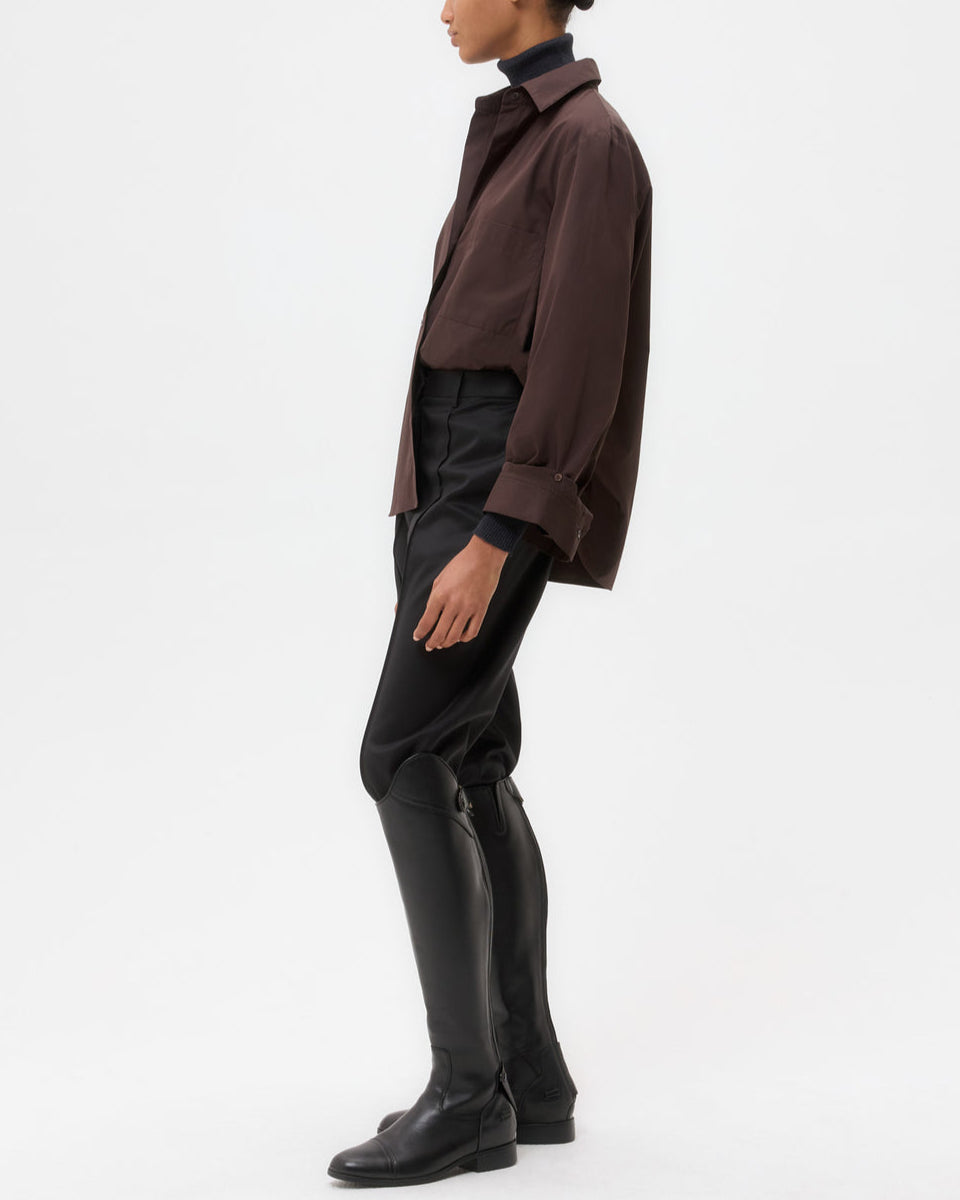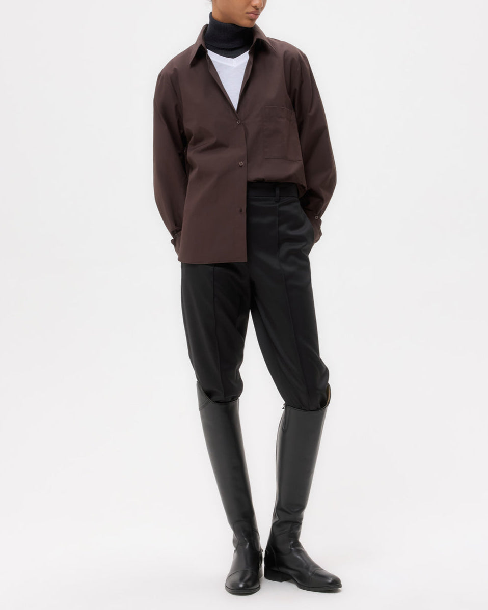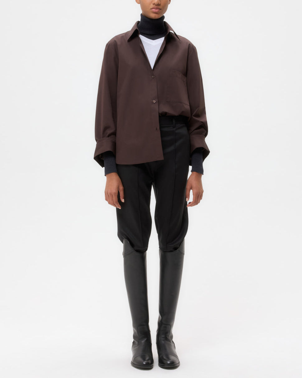 Oversized button down shirt in super compact cotton poplin. This fabric is structured with a smooth texture and crisp hand feel.  The Next Morning is a relaxed silhouette with a center box pleat at the back. Complete with an exposed button up placket, chest patch pocket, spread collar and single roll button cuffs.