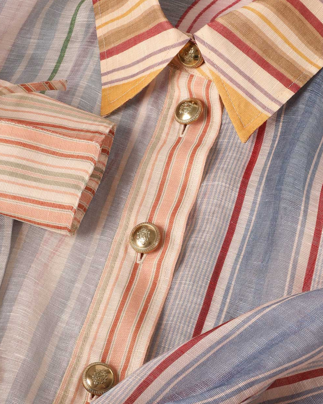 The Rebellion Striped Blouse in Spliced Stripes from Cruise 2026 Collection, Twisted Romance. A silk-linen blouse featuring a classic collar, buttons down the centre front, long billow sleeves with exaggerated cuffs, finished with a wrap waist belt tied to one side.