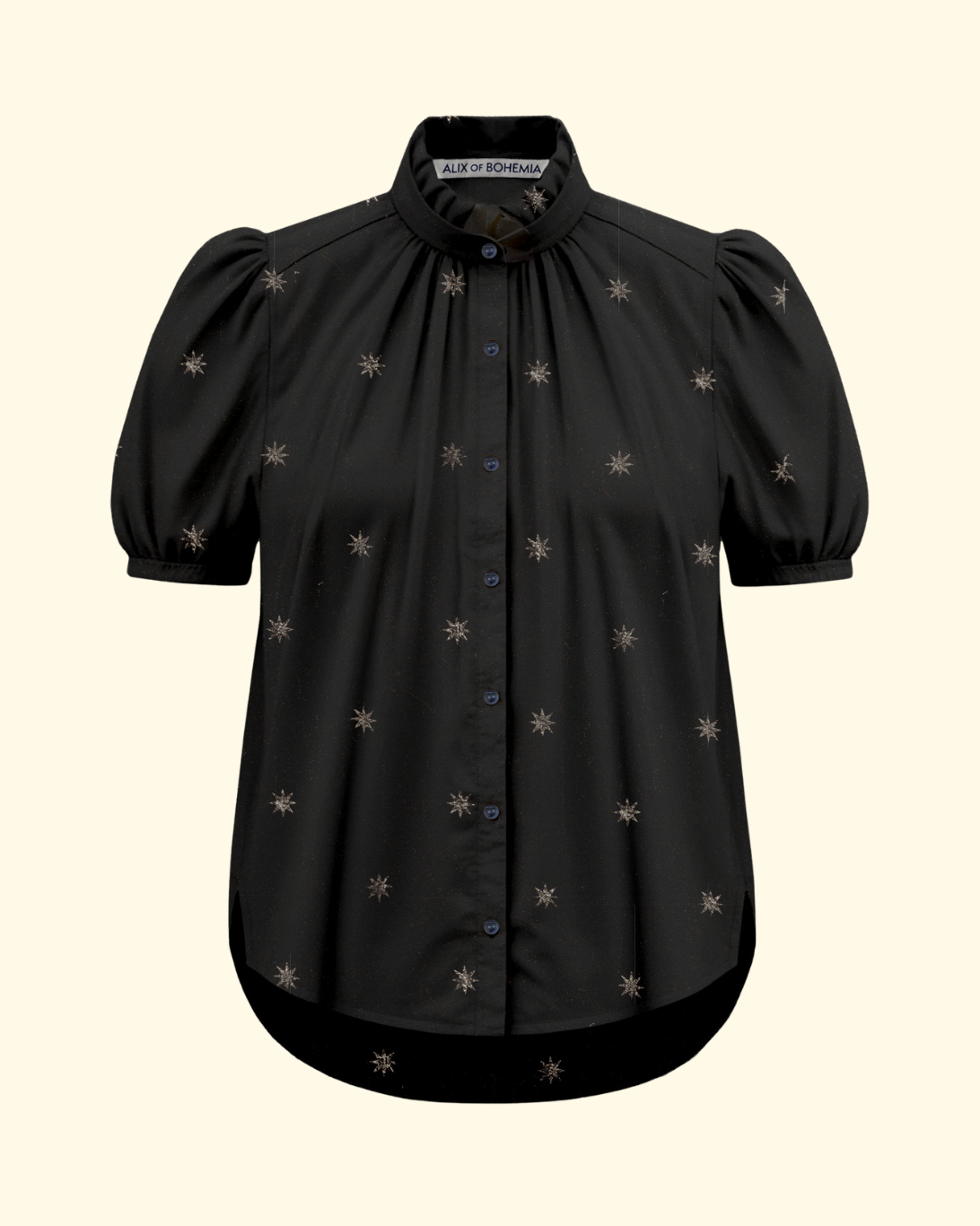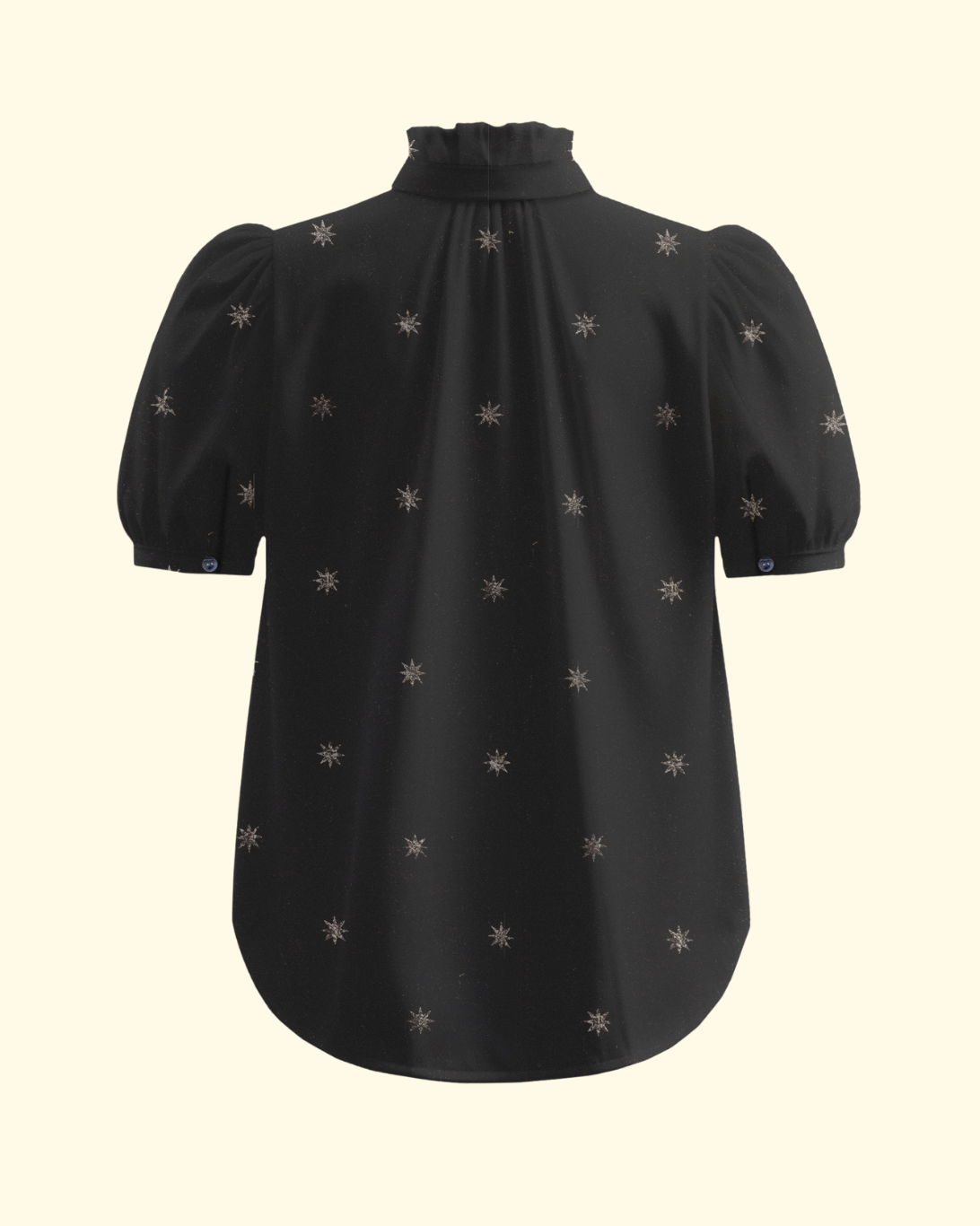 A perennial favorite, the Winnie has puff shoulders and a feminine ruffled collar. Our cotton-silk blend shirt features a metallic star motif.