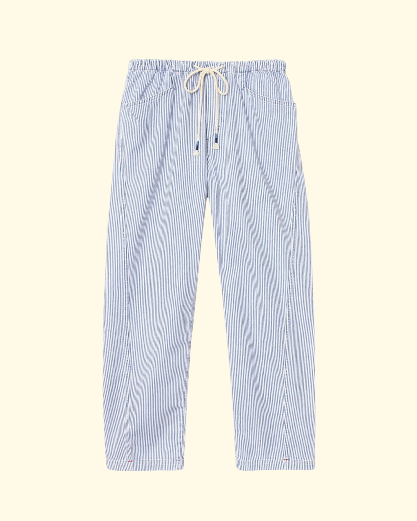 Baxter is updated this season in our railroad striped denim. This slightly cropped pull on pant features an elasticized drawstring waist with rope cord detail, front square pockets, flap back pockets with button closure, and a subtle barrel leg.
