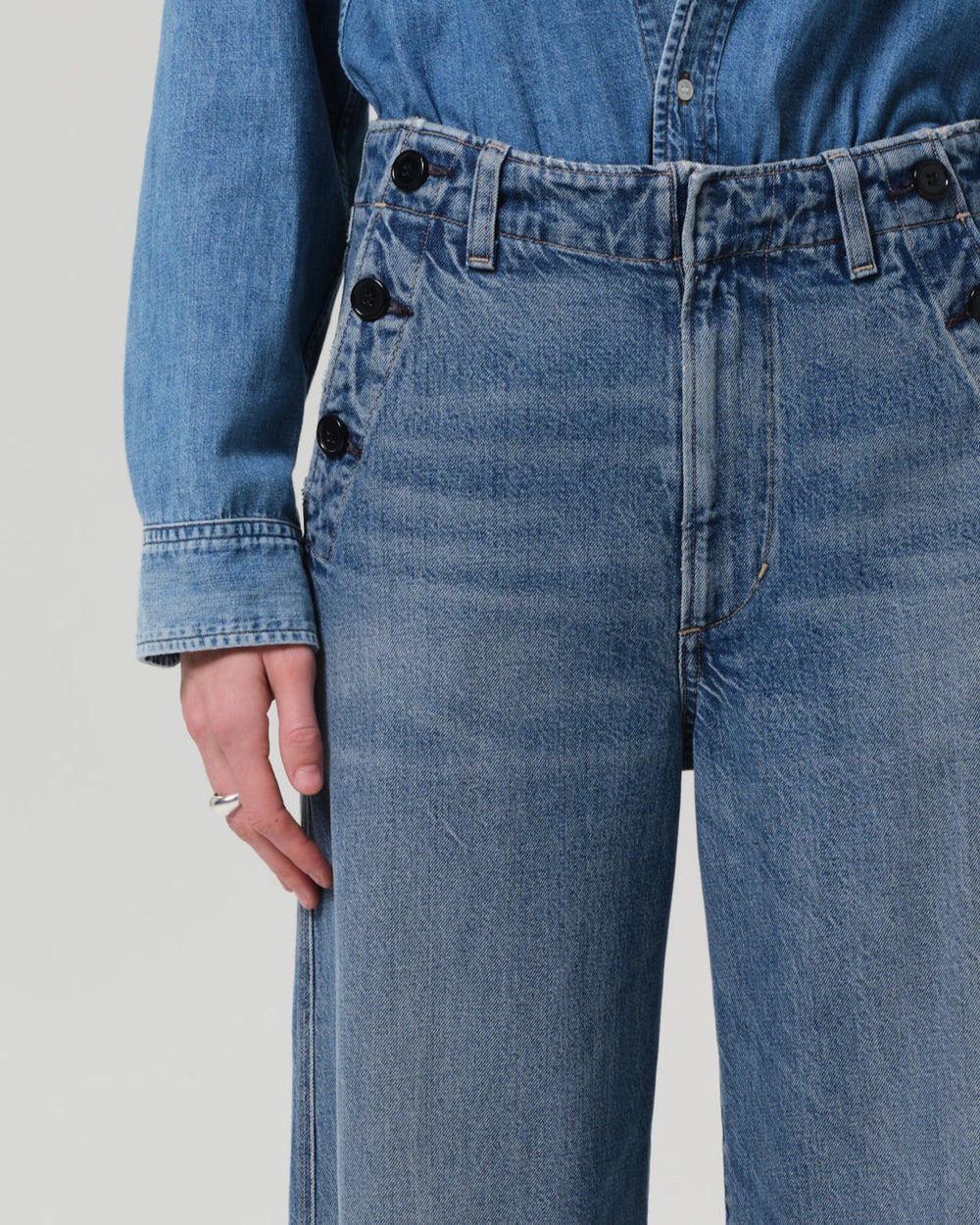 The Boardwalk Trouser draws inspiration from classic nautical styling with its signature button placement and sailor pant silhouette. The flowy, billowy leg offers an easy, relaxed fit that feels both effortless and sophisticated. Crafted from medium indigo denim, this piece is perfect for styling with tonal separates for a chic, monochromatic look that’s as elevated as it is laid-back. A versatile addition to any summer wardrobe.