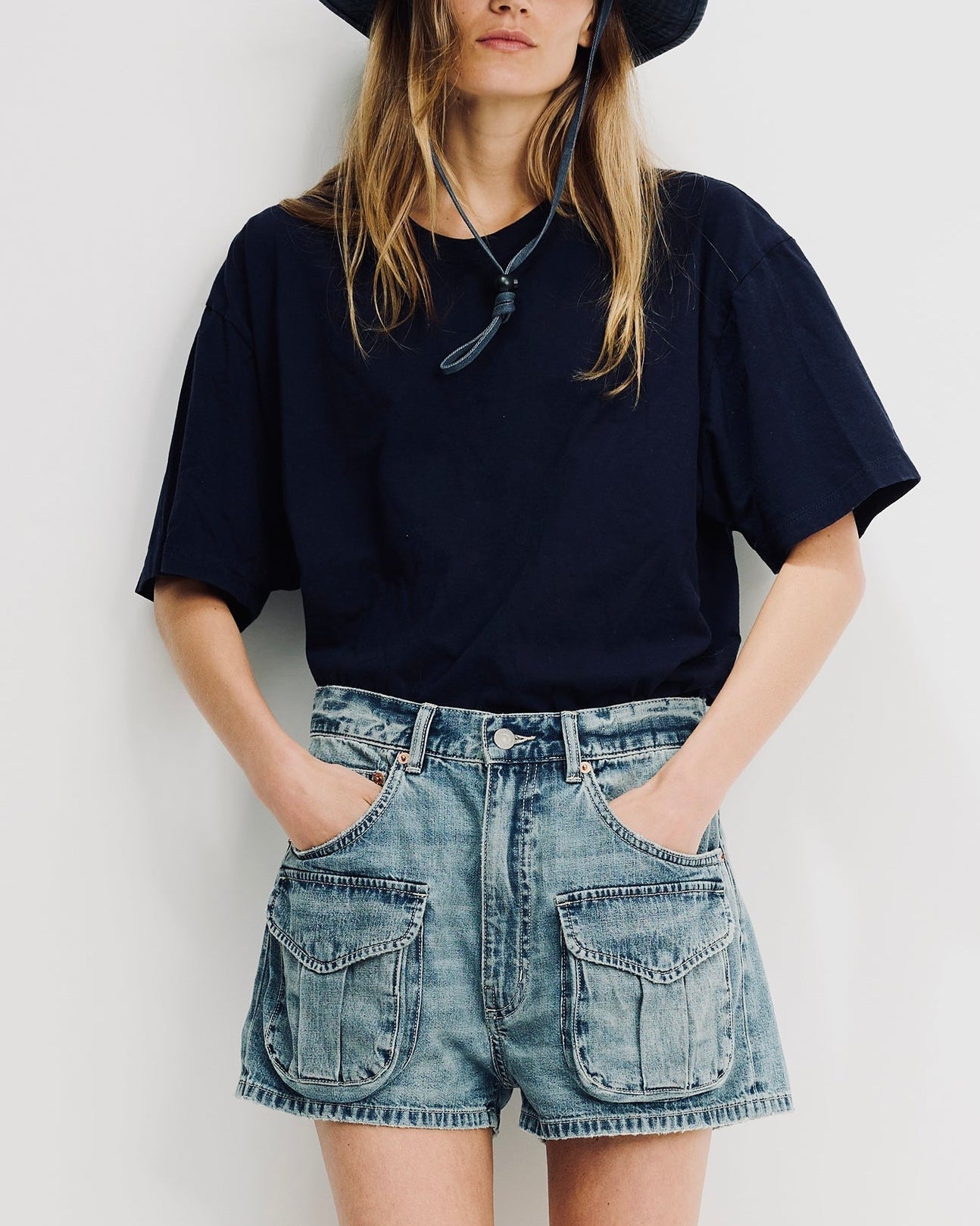 Denim cargo short with curved front patch pockets and exposed seaming. Mid-rise fit with a zip fly and belt loops. Finished in a vintage Holton indigo wash.