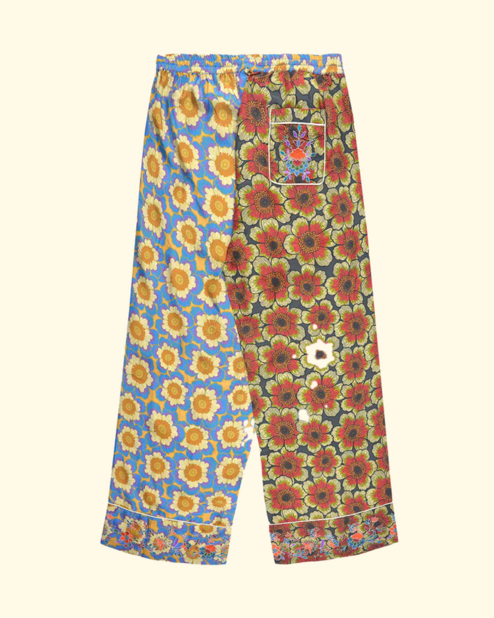 The Opium Pants are silk trousers featuring a bold bi-color pattern in blue and red, designed to perfectly complement both the Opium Shirt Blue and Opium Shirt Red. Their fluid and lightweight fabric offers an elegant drape, while the striking design combines comfort with sophistication. Ideal for creating a coordinated look or adding a pop of color to your wardrobe, they embody timeless bohemian chic.