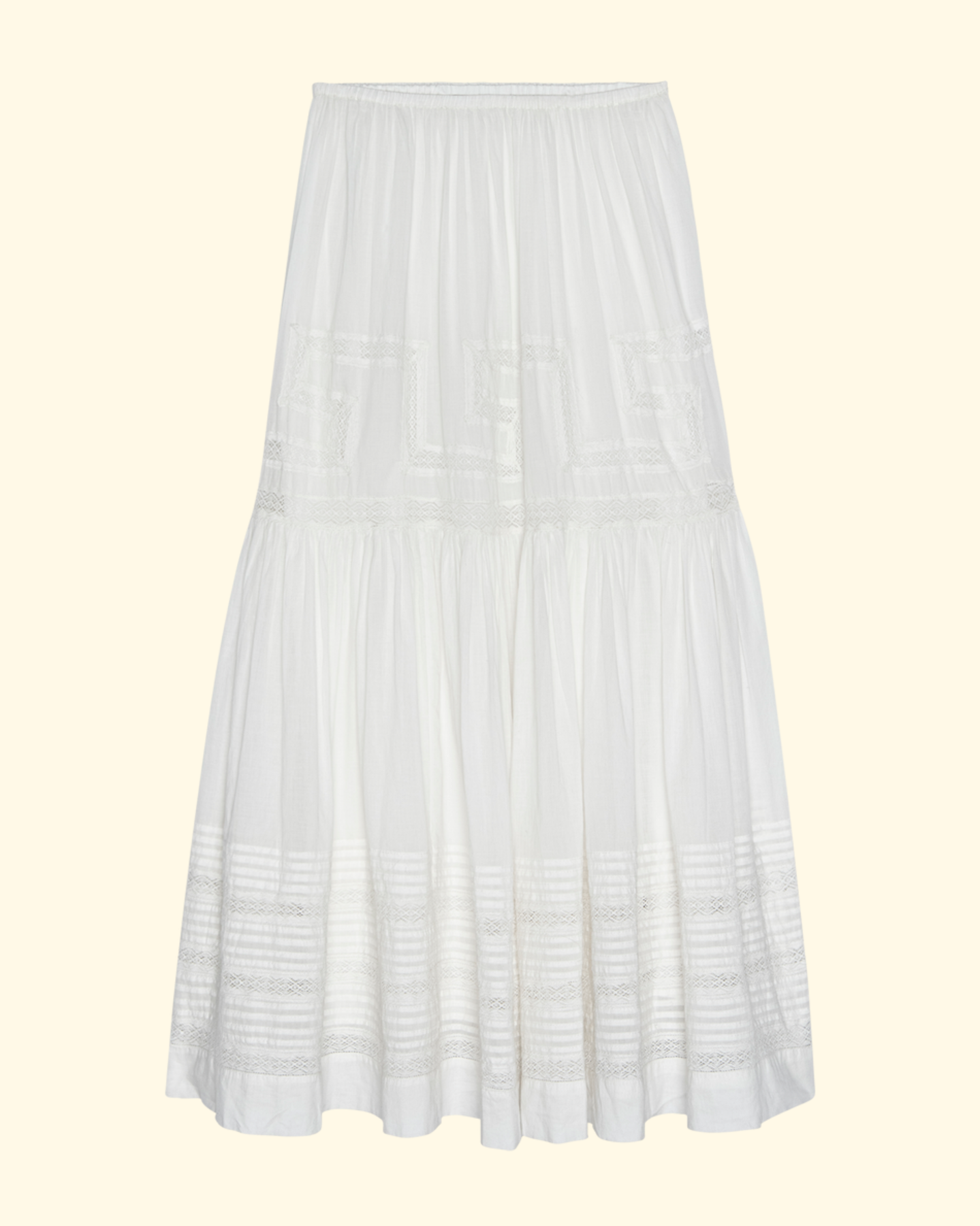 The Victorian Skirt feels like a treasured heirloom, crafted from delicate cotton and lace with thoughtful details throughout. Designed to be both beautiful and easy to wear, it features an elasticated waist and a long, flowing silhouette that hits at the ankles. A lace inset in a classic Greek key pattern adds subtle texture, while a soft tier above the knee and the most delicate rows of pintucks frame the hem. Romantic yet effortless, it’s the kind of piece that feels special every time you put it on.