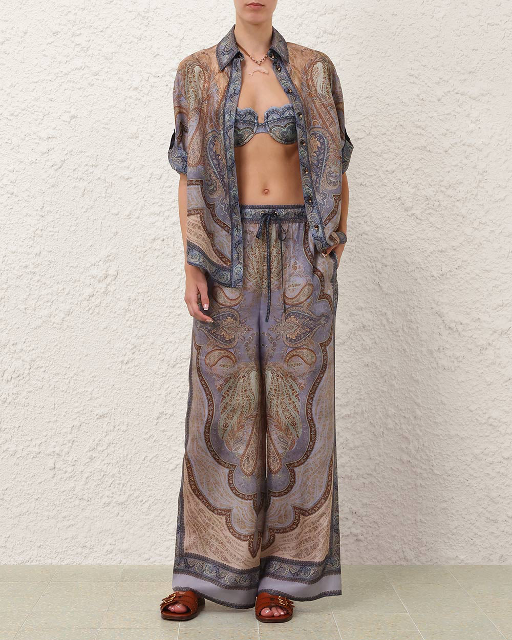 The Wanderlust Relaxed Pant in Tapestry Blue Multi from our Swim 2026 Collection. A 100% silk habutae mid-rise pant featuring a relaxed silhouette, bold placement print and a drawstring waist.