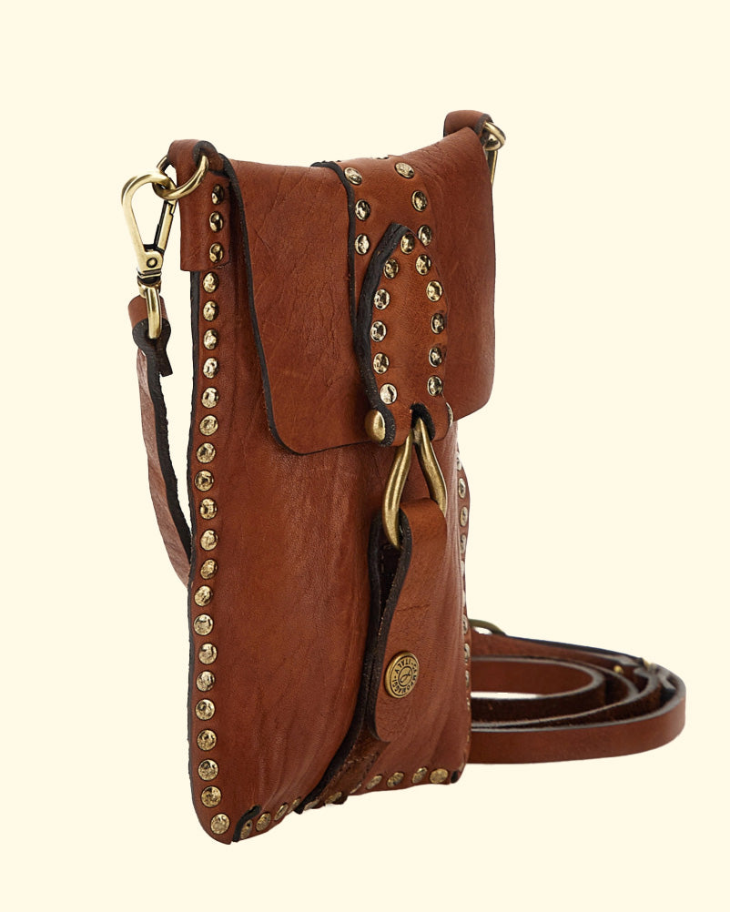 Mobile phone holder made from washed cowhide leather with small rivets. Featuring snap button fastening, gold finish on accessories, and adjustable and removable cross body strap. The “Grecale” line is made up of models with simple, clean lines, embellished by the decorative accessory inserted as a fastening or eyelet