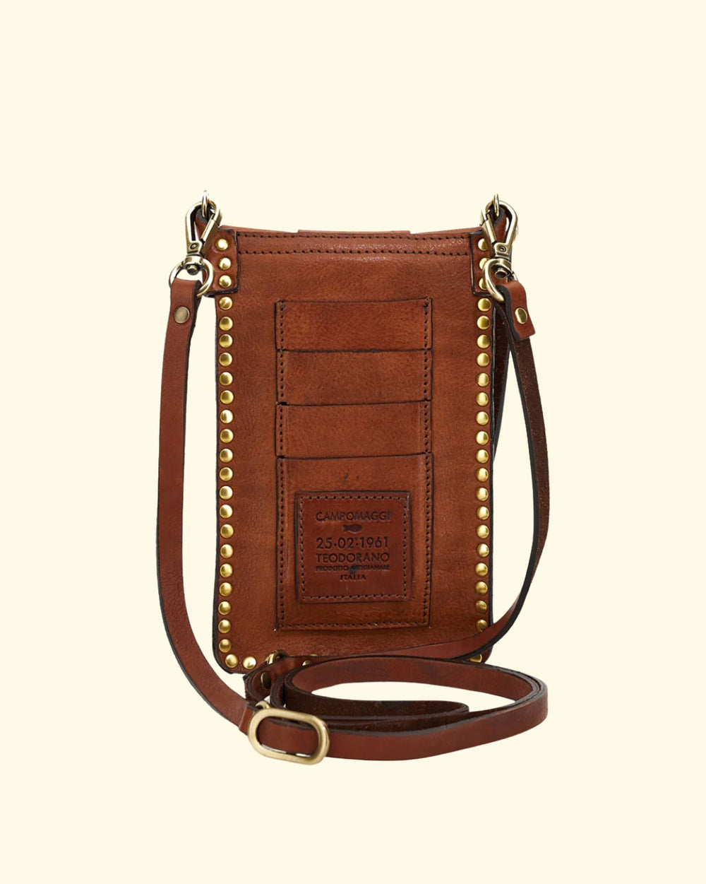 Practical cell phone holder, with credit card and document compartments on the back. The shoulder strap is adjustable and removable. Made of cowhide leather with rivets. Made in Italy.