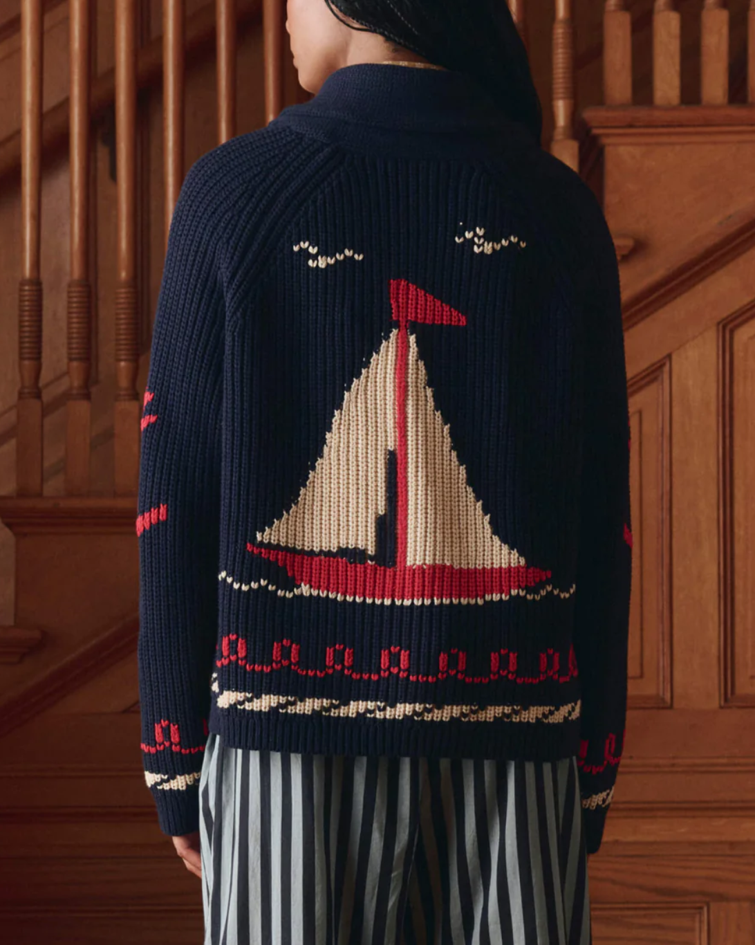 Inspired by a 1960s kids' sweater, The Sailboat Lodge Cardigan features hand-embroidered boats and sailor motifs on our best-selling Lodge Cardigan. Spun from a soft cotton blend yarn, this cozy piece beautifully blends maritime nostalgia with everyday comfort.