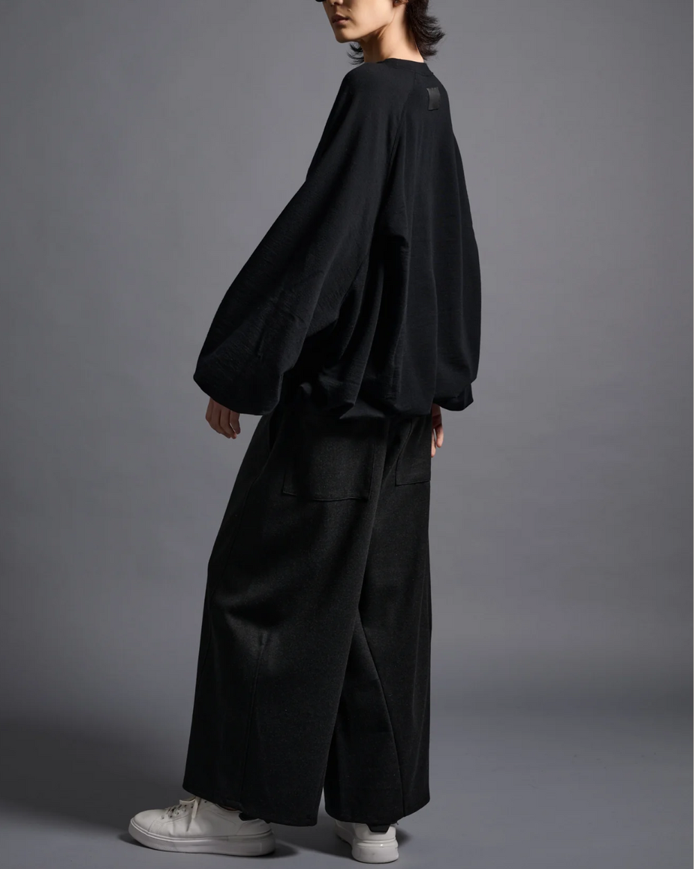 Oversized long sleeve sweatshirt. This sweatshirt has a very contemporary, over-sized silhouette thanks to the full, long sleeves being tucked against a slightly shorter body.