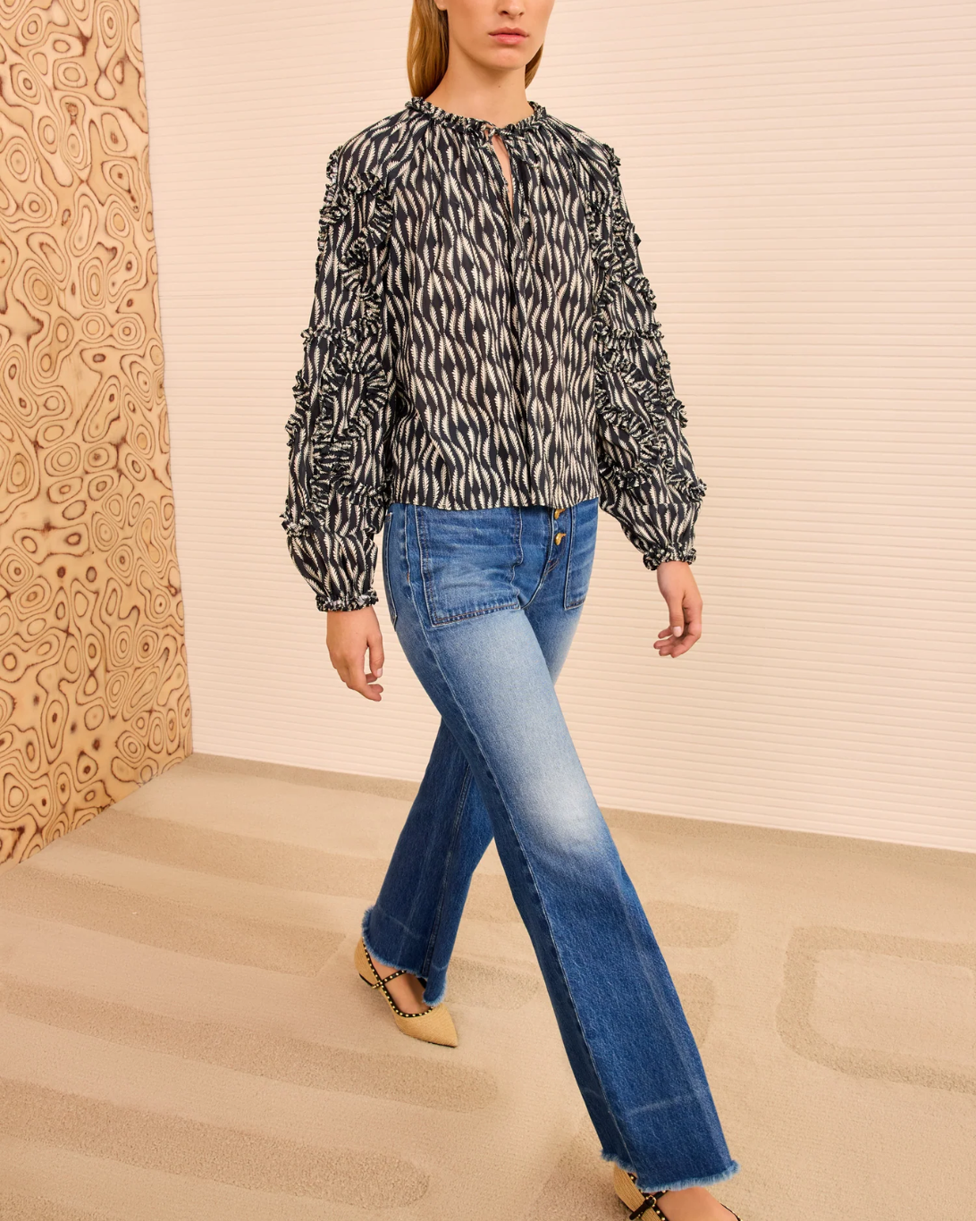 Graphic elegance arrives in the Azrou Blouse, crafted of black cotton-blend with feather-like vines patterned atop delicate stripes. This blouse has a fluid fit and neckties that fasten or can be left undone for a relaxed touch.