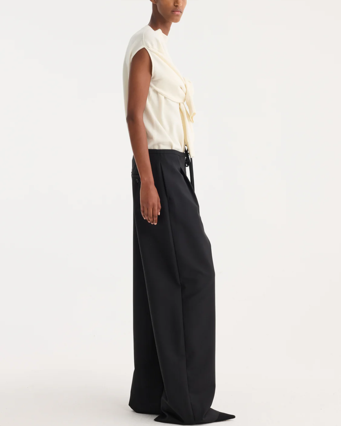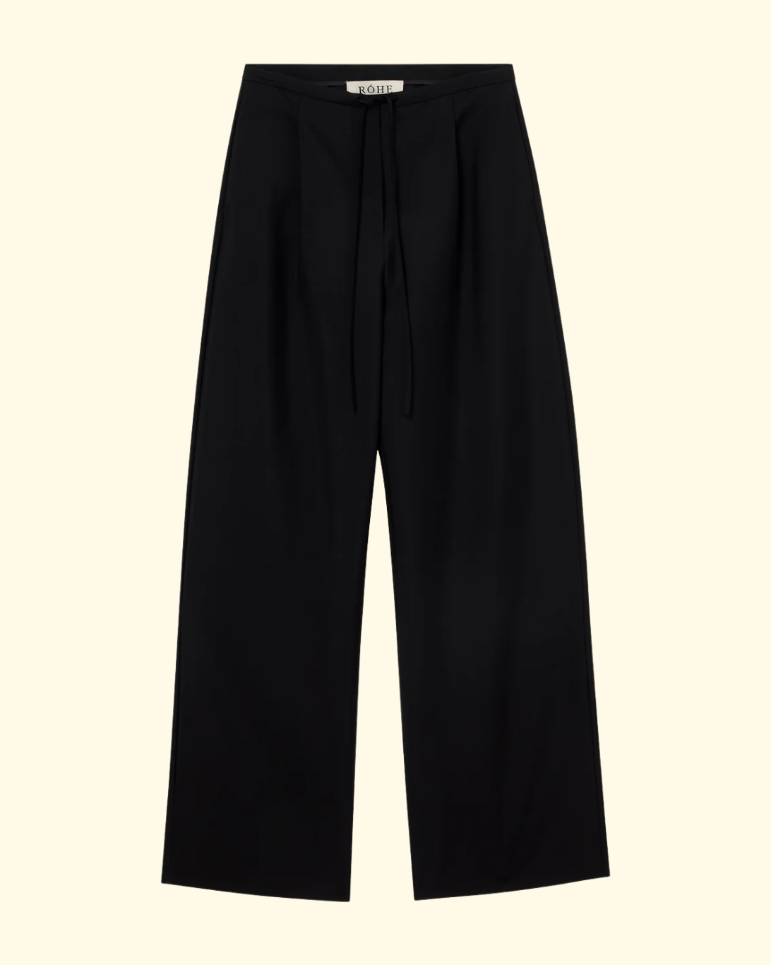 Relaxed drawstring trousers crafted from a soft wool and mohair blend fabric, offering a perfect blend of elegance and ease. Designed in a long flowing silhouette with front pleats, back welt pockets, and a casual chic drawstring waistband.