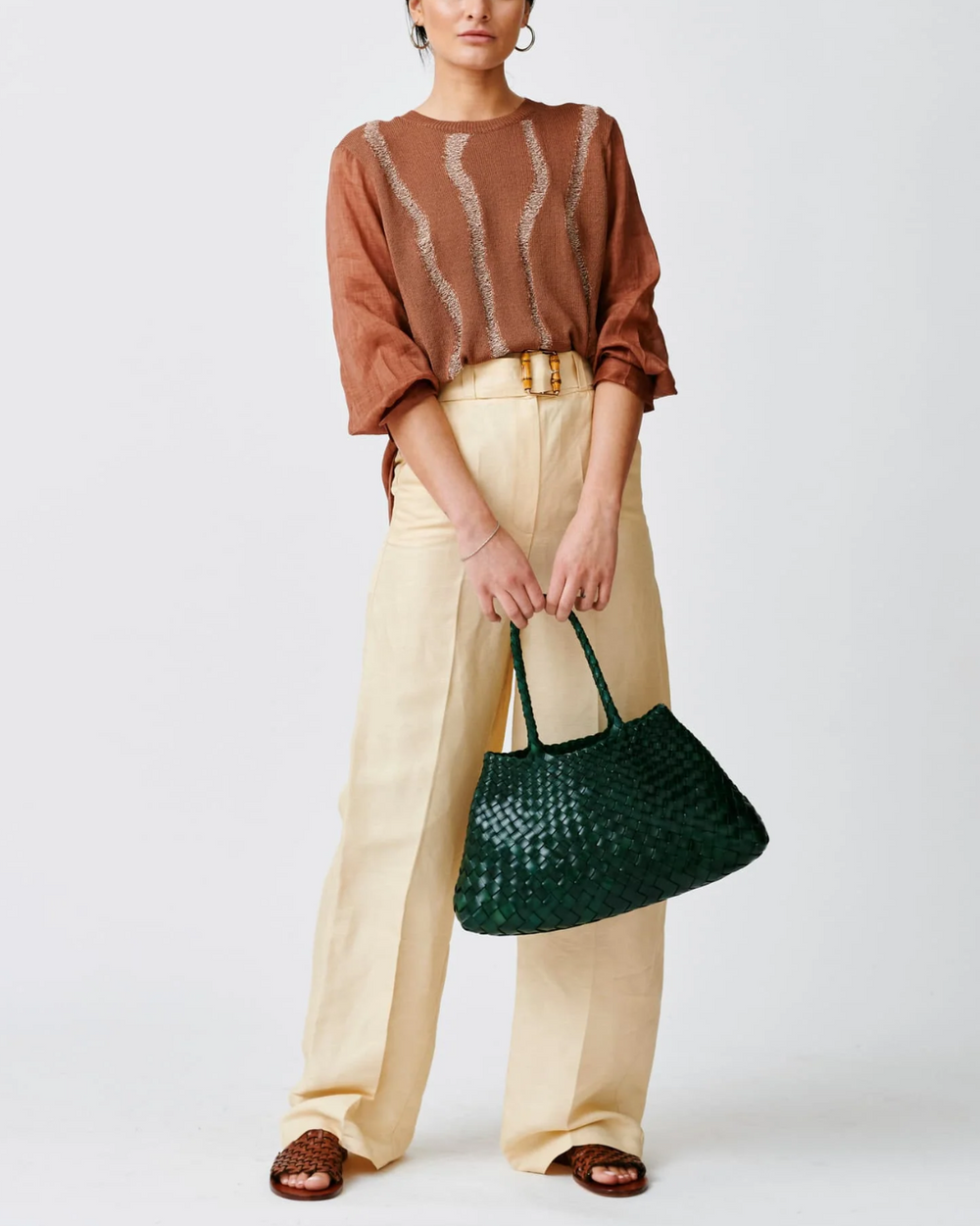 Santa Croce bag is formed of irregular leather weaving straps that taper towards the brim, creating a practical yet elegant shape that’s perfect for running around the city—taking your outfit from day to night. Remaining true to traditional basket weaving techniques, the Santa Croce comes unlined and has an open top.