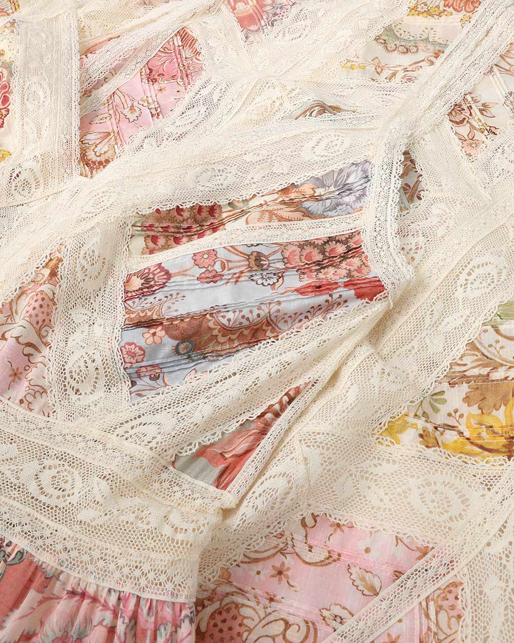 The Daylight Slip Dress in Spliced Print from the Resort Swim 2026 Collection. A cotton maxi dress featuring a V-neckline, self-bow-tie straps, finished with an invisible zip closure at centre back and spliced and lace trim throughout. Featured a mini-length lining.