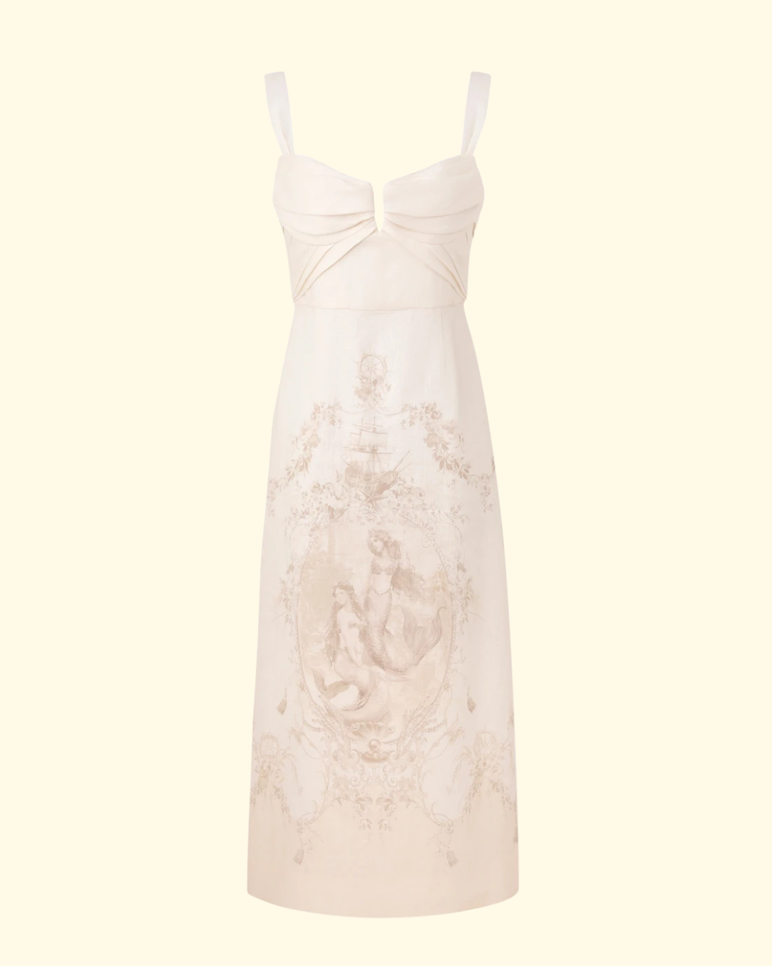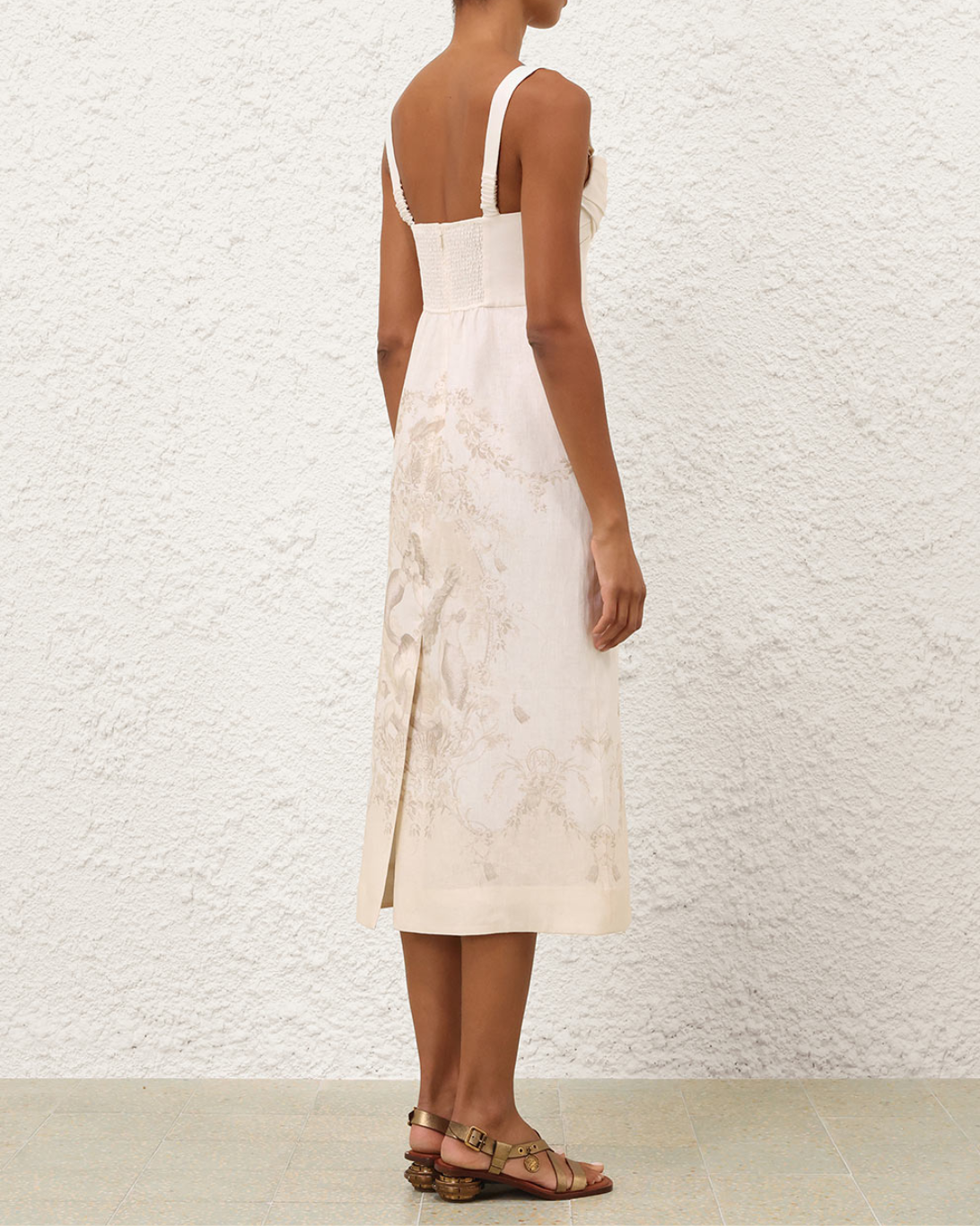 The Drape Midi Dress in Mermaid Toile from Cruise 2026 Collection, Twisted Romance. A linen midi dress featuring a fitted bodice, shirred back and straps, keyhole detailing across bust, finished with an invisible zip closure and ruching.