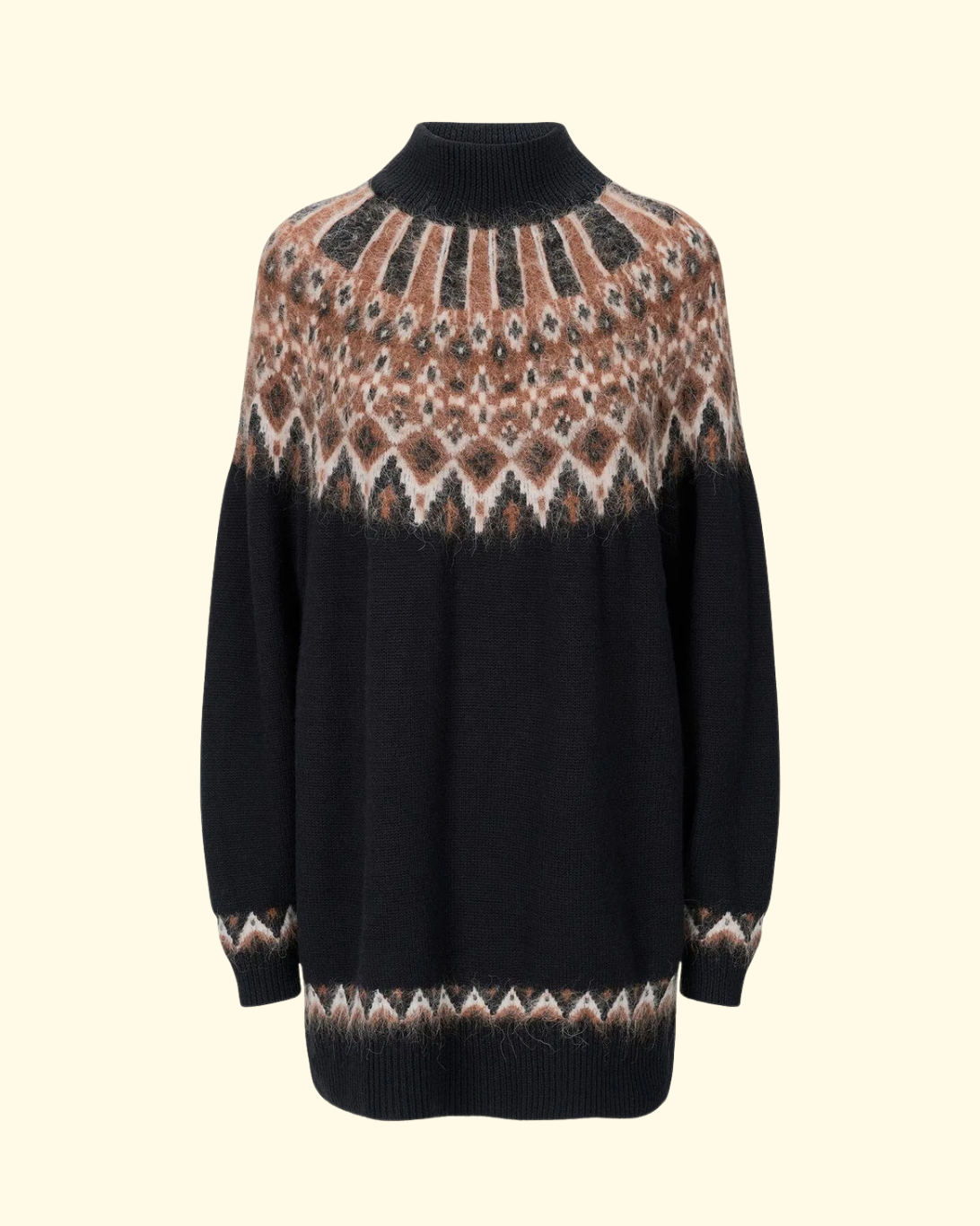 A cozy wool blend turtleneck dress, the Liza features a fairisle jacquard pattern and slightly boxy fit.