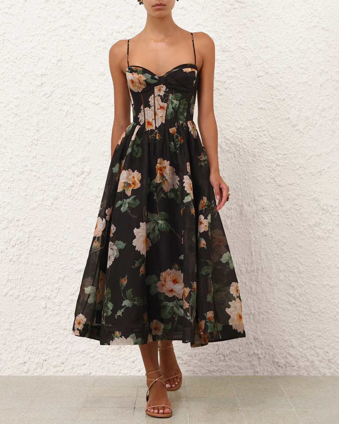 The Luna Corset Midi Dress in Black Rose from the Spring 2026 Collection, Kindred Spirit. A silk-linen midi dress featuring a fitted corset bodice, sweetheart neckline, adjustable straps, finished with a centre back zip and full flare skirt.