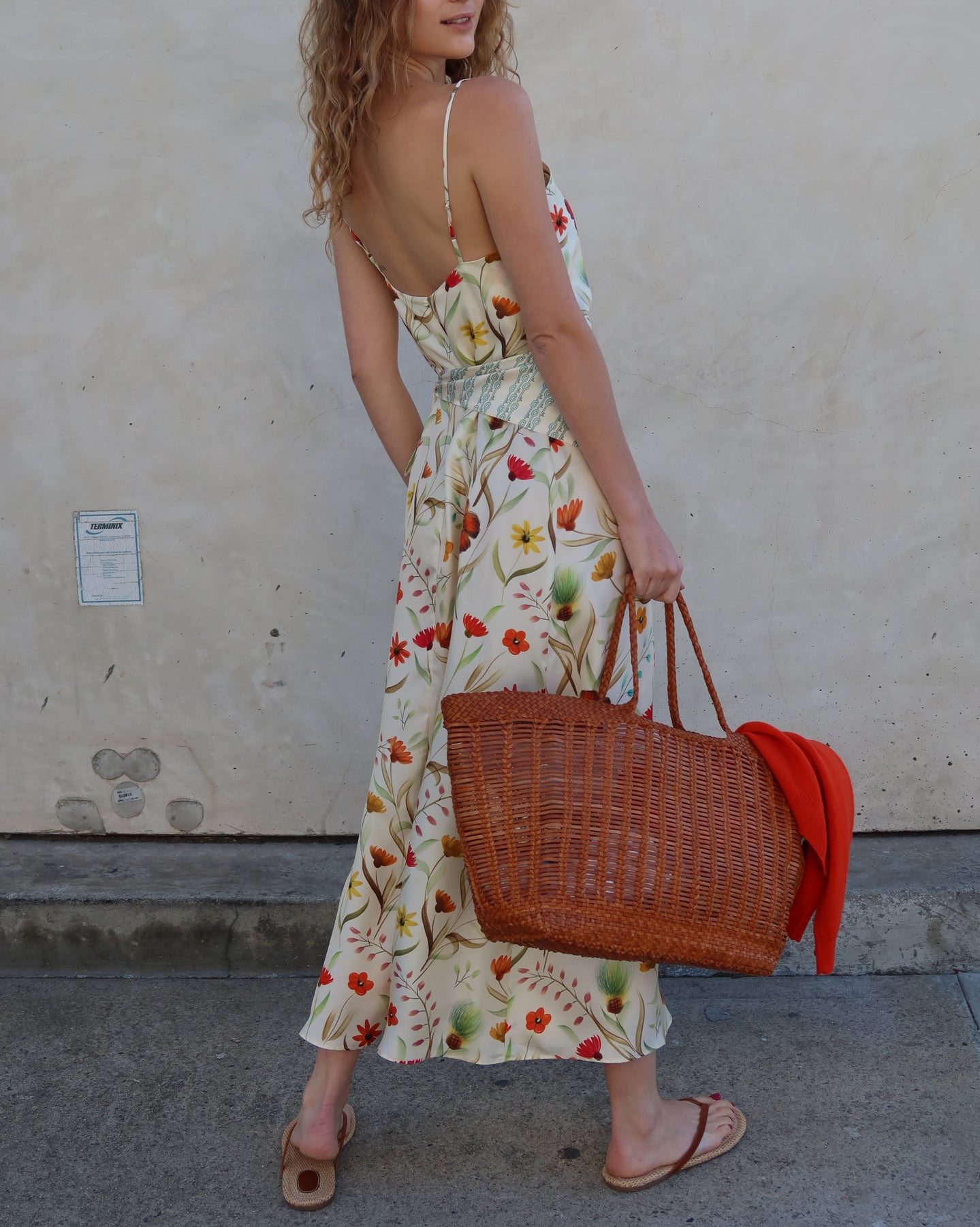 Sleeveless dress with open v-neck, with spaghettini straps and a gold button on the back. Made in Europe.