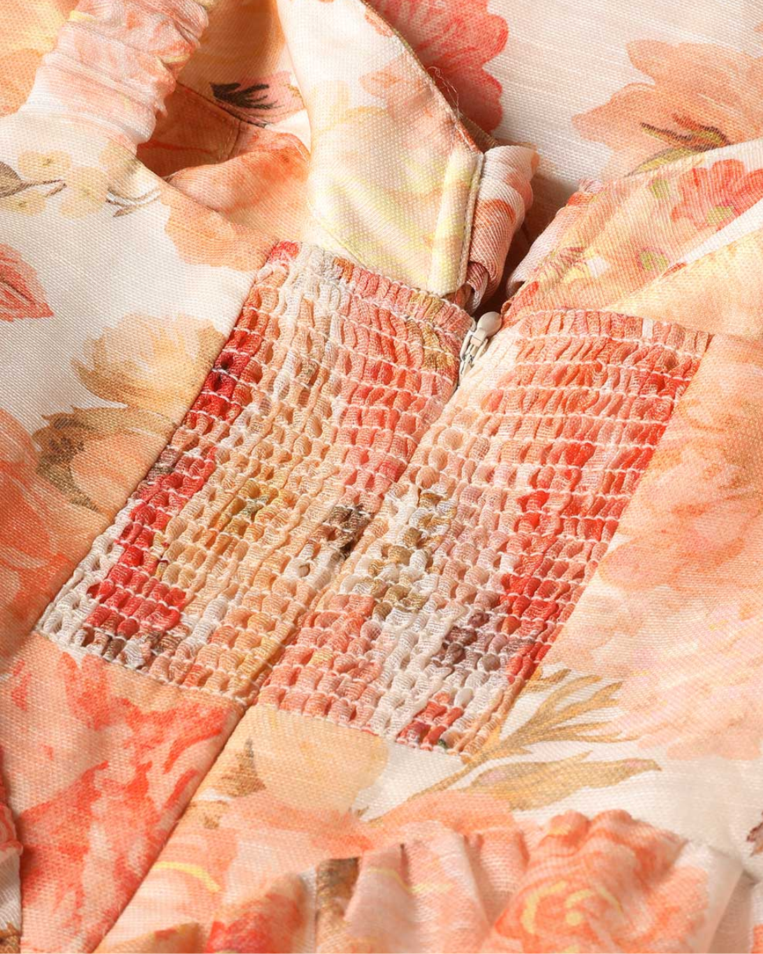 The Rebellion Drape Midi Dress in Golden Bloom from Cruise 2026 Collection, Twisted Romance. A silk-linen organza midi dress featuring a sweetheart neckline, drape detailing at the bust and a full flared skirt.