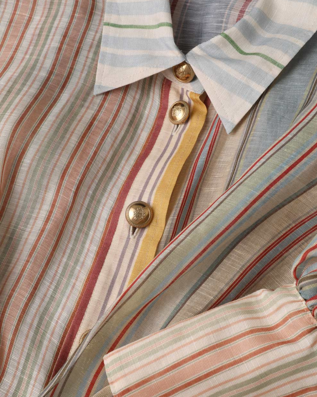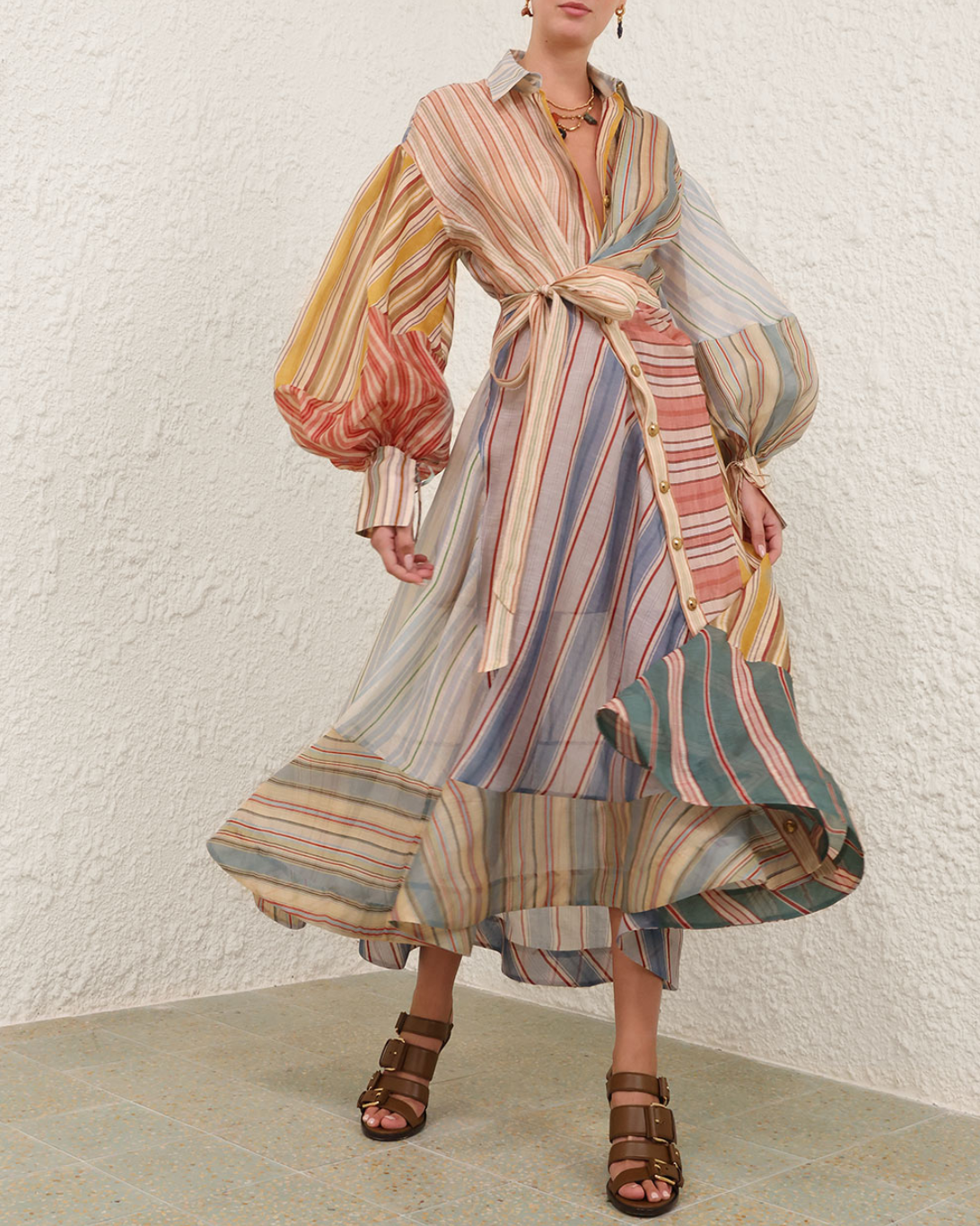 The Rebellion Striped Midi Dress in Spliced Stripes from our Cruise 2026 Collection, Twisted Romance. A silk-linen midi dress featuring a classic collar, buttons down the centre front, long billow sleeves with exaggerated cuffs, finished with a wrap waist belt tied to one side.