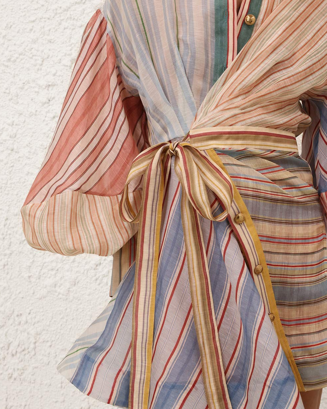 The Rebellion Striped Mini Dress in Spliced Stripes from our Cruise 2026 Collection, Twisted Romance. A silk-linen mini dress featuring a classic collar, buttons down the centre front, long billow sleeves with exaggerated cuffs, finished with a wrap waist belt tied to one side.
