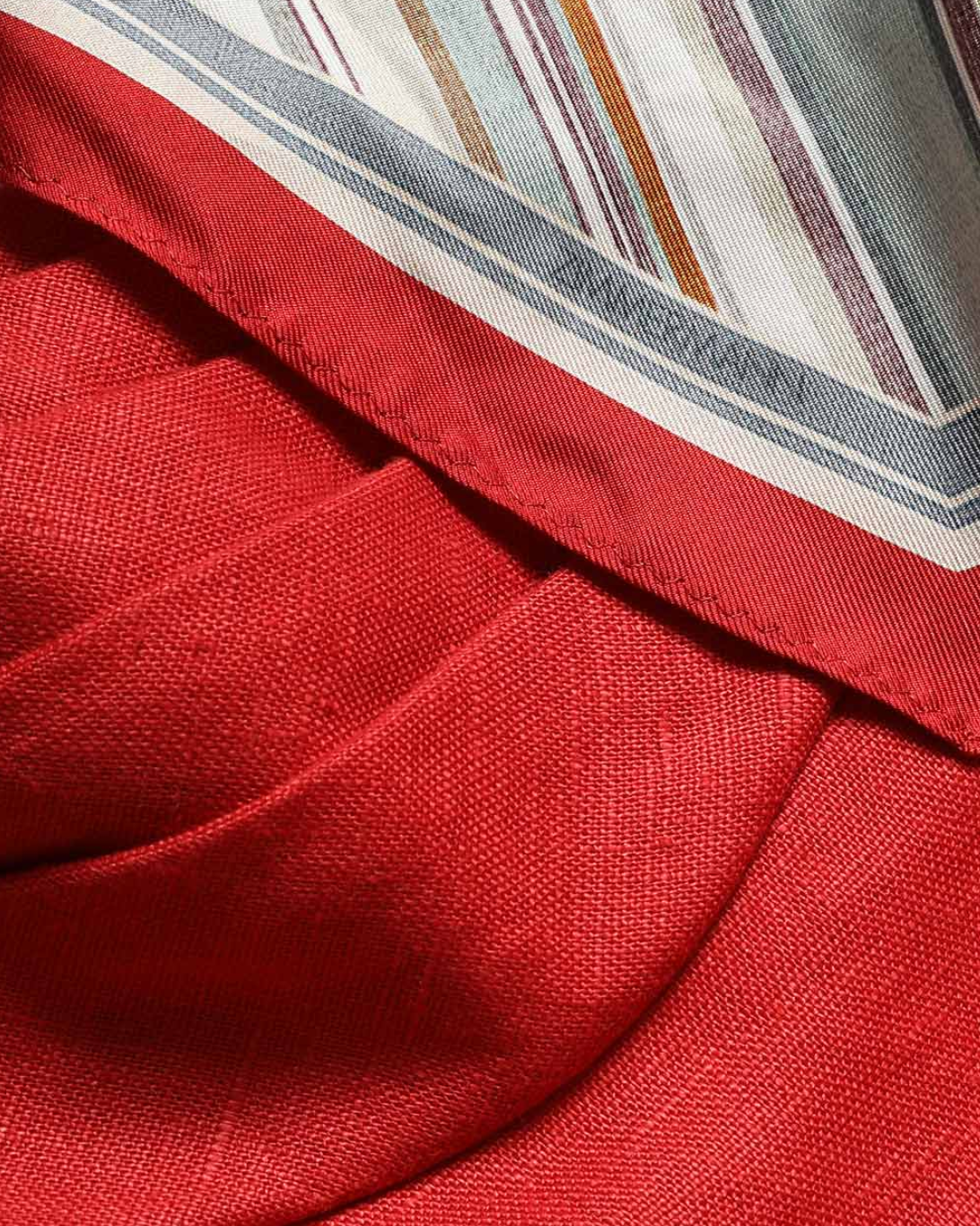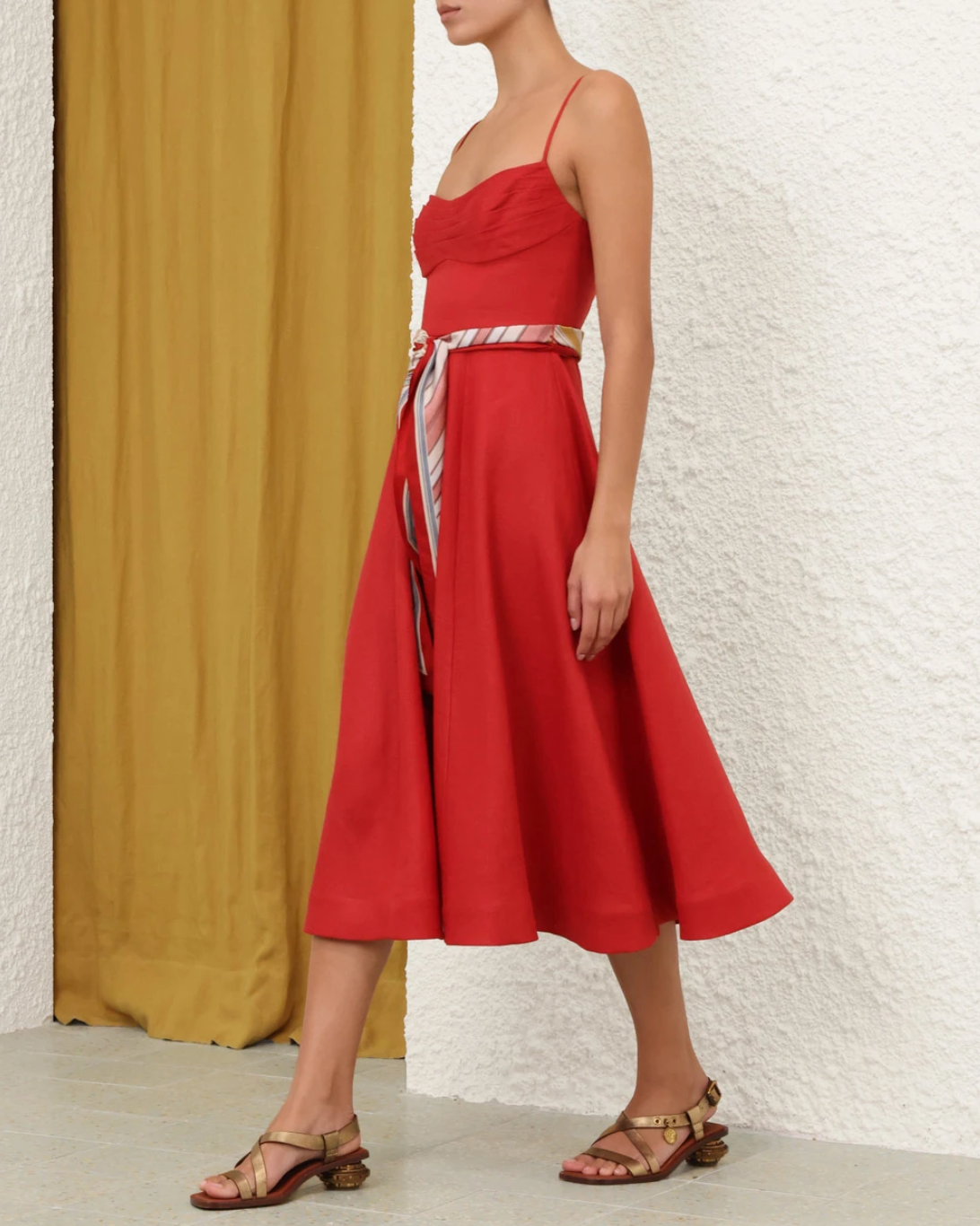 The Rebellion Tuck Midi Dress in Red from Cruise 2026 Collection, Twisted Romance. A linen midi dress featuring drape detailing across the bust, adjustable straps, finished with a full flare skirt.