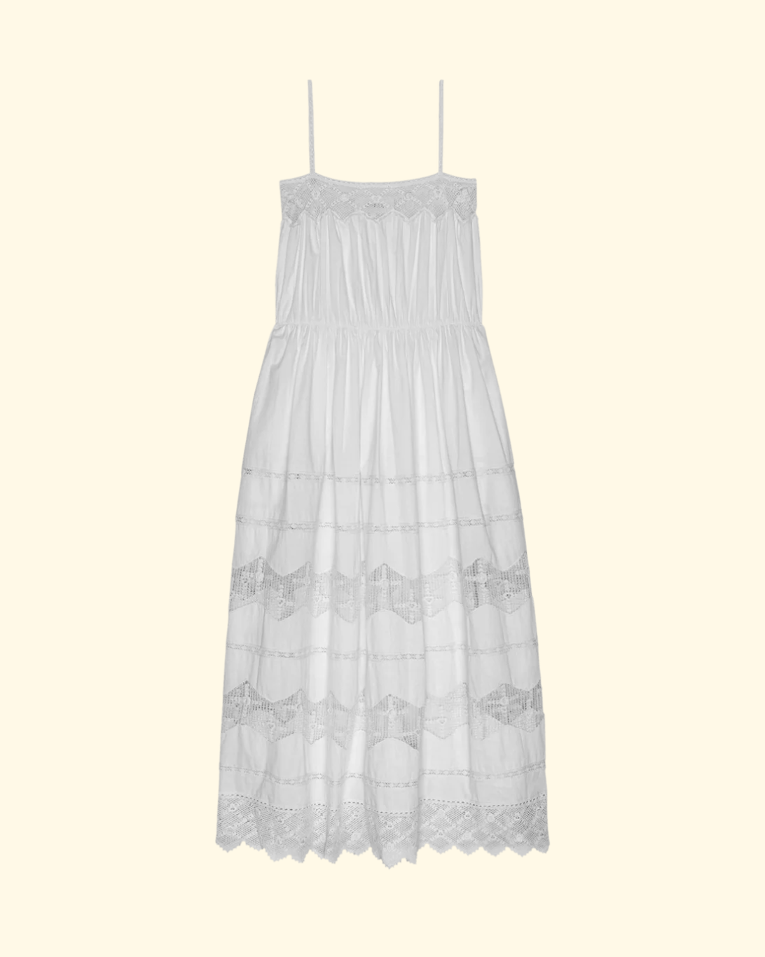 A sleeveless dress with the most delicate, considered details—romantic in spirit and quietly reminiscent of another time. A softly shirred bodice is framed with Victorian-inspired rosette lace, drawing the eye with a sense of gentle ornamentation. A defined waist seam releases into a full skirt, finished with intricate rows of lace that add movement and texture.