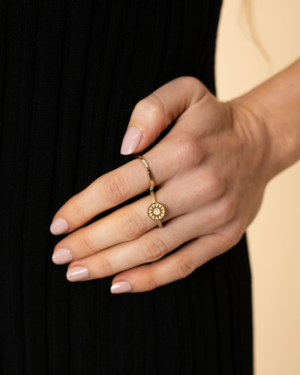 The pavé set diamonds on the Square Diamond Band radiate outwards in the four cardinal directions, keeping us centered as we navigate life’s journey
