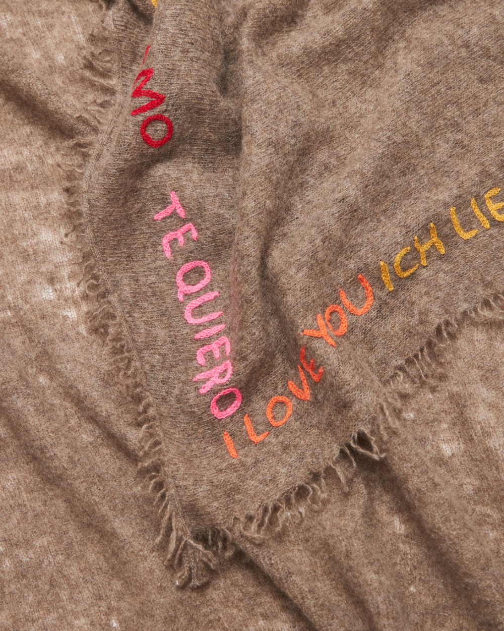 The scarf of the season is called Te Quiero. Classic rectangular design in pure cashmere but with refined and loving multi-colored embroidery along the edges. Love always inspires.