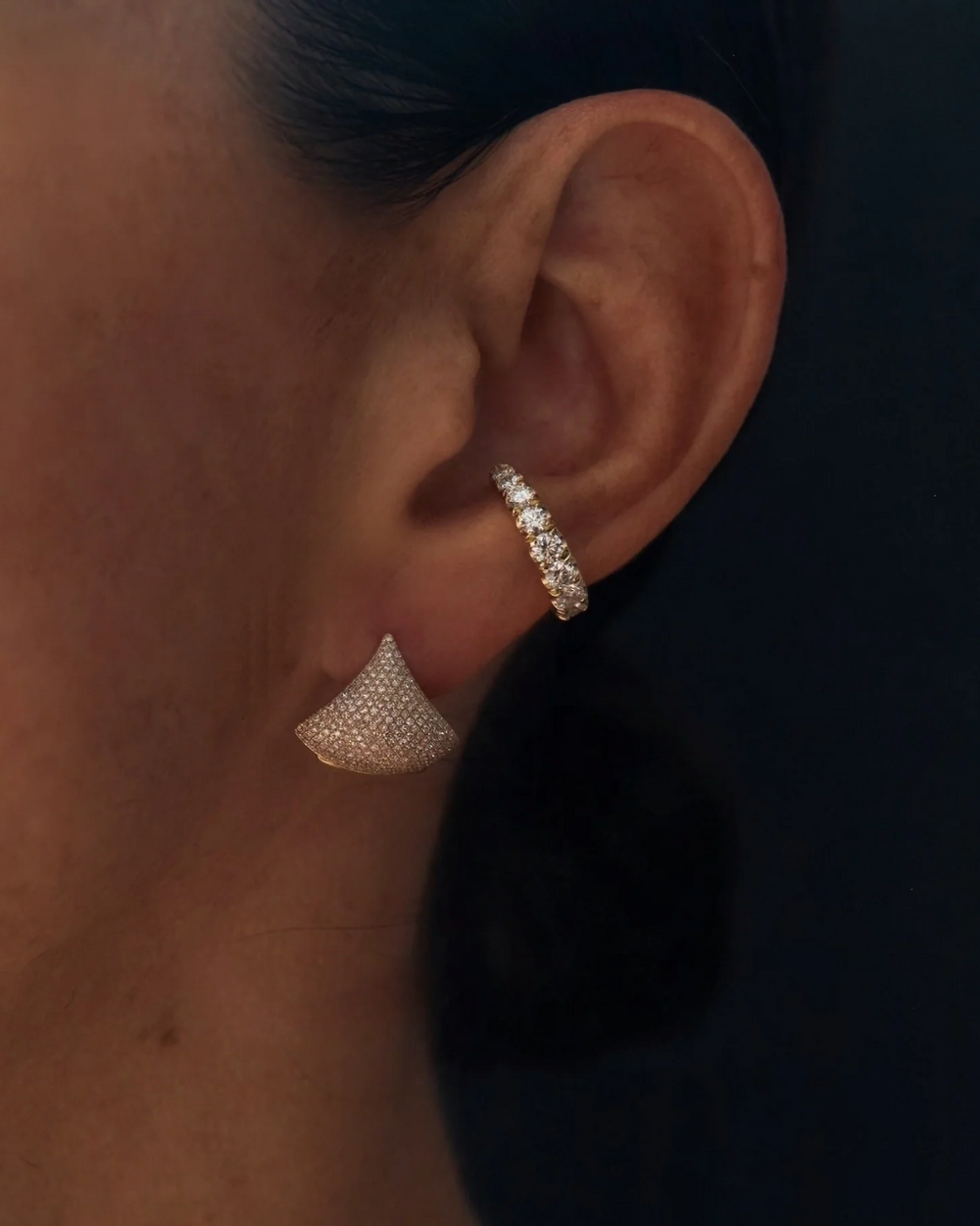 The Large Apse Earrings with White Pave Diamonds are made in 14K and micro pave diamonds with a unique hinged design that allows the earring to frame the ear lobe gracefully with shine.