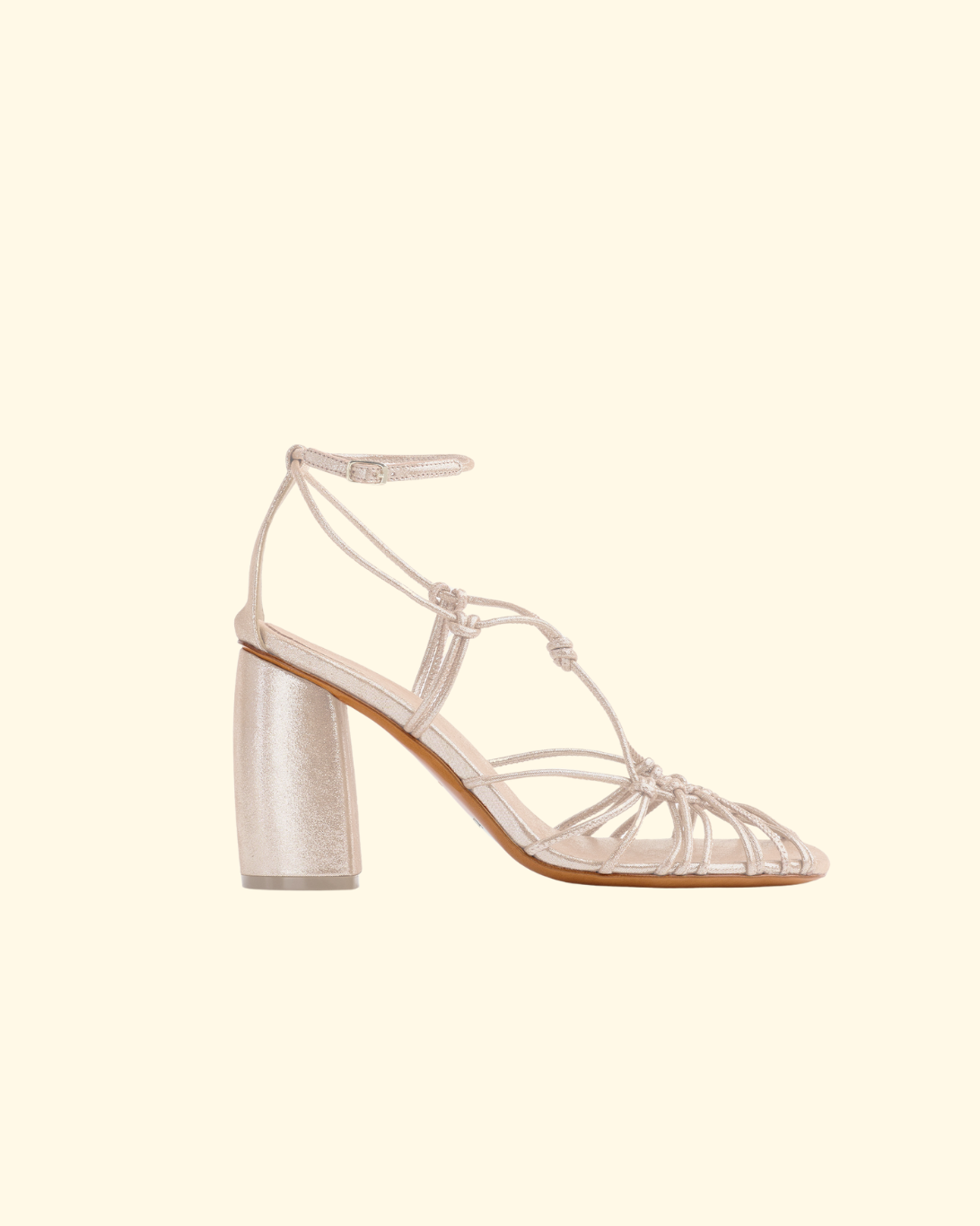 Delicate weaves of laminated nappa mini—strips wrap around the foot, creating the refined texture of these high—heeled sandals. open—toe shapes with ankle straps are complemented by the leather’s shimmer, covering both the high heel and platform. Made in Italy.