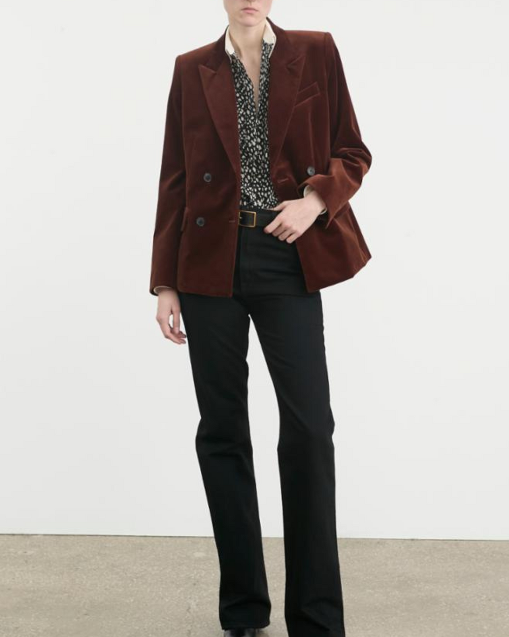 Classic, straight fit double breasted jacket. Signature crest buttons in antique gold brass. Chest pocket. Single interior chest pocket.