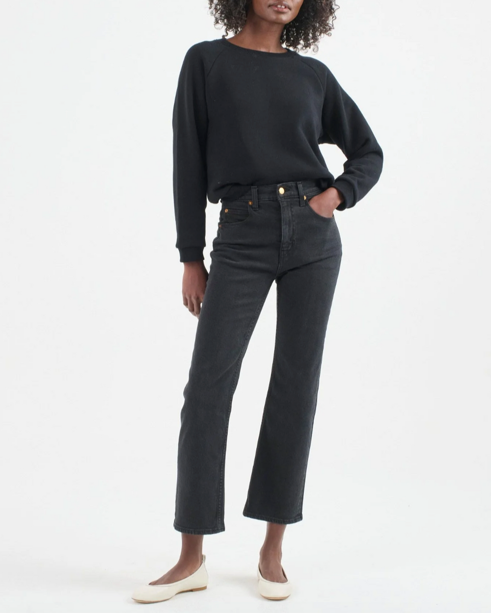 An iconic, mid-rise, ankle length jean. A vintage inspired overdyed black jean is an understated way to dress down black denim. A casual wash that looks great styled back to Navy, Tan, Ecru and Black. The Kenickie Jean is the perfect loafer jean.  A sliver of ankle is exposed with this 28” inseam.