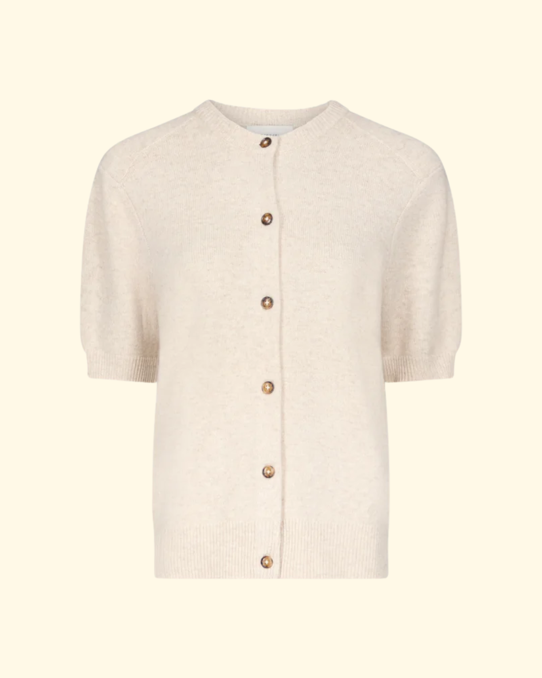 This cardigan is made of pure cashmere. Its straight fit is complete with short sleeves, a buttoned front opening and a crew neck. Details include ribbing on the collar, hem and cuffs.