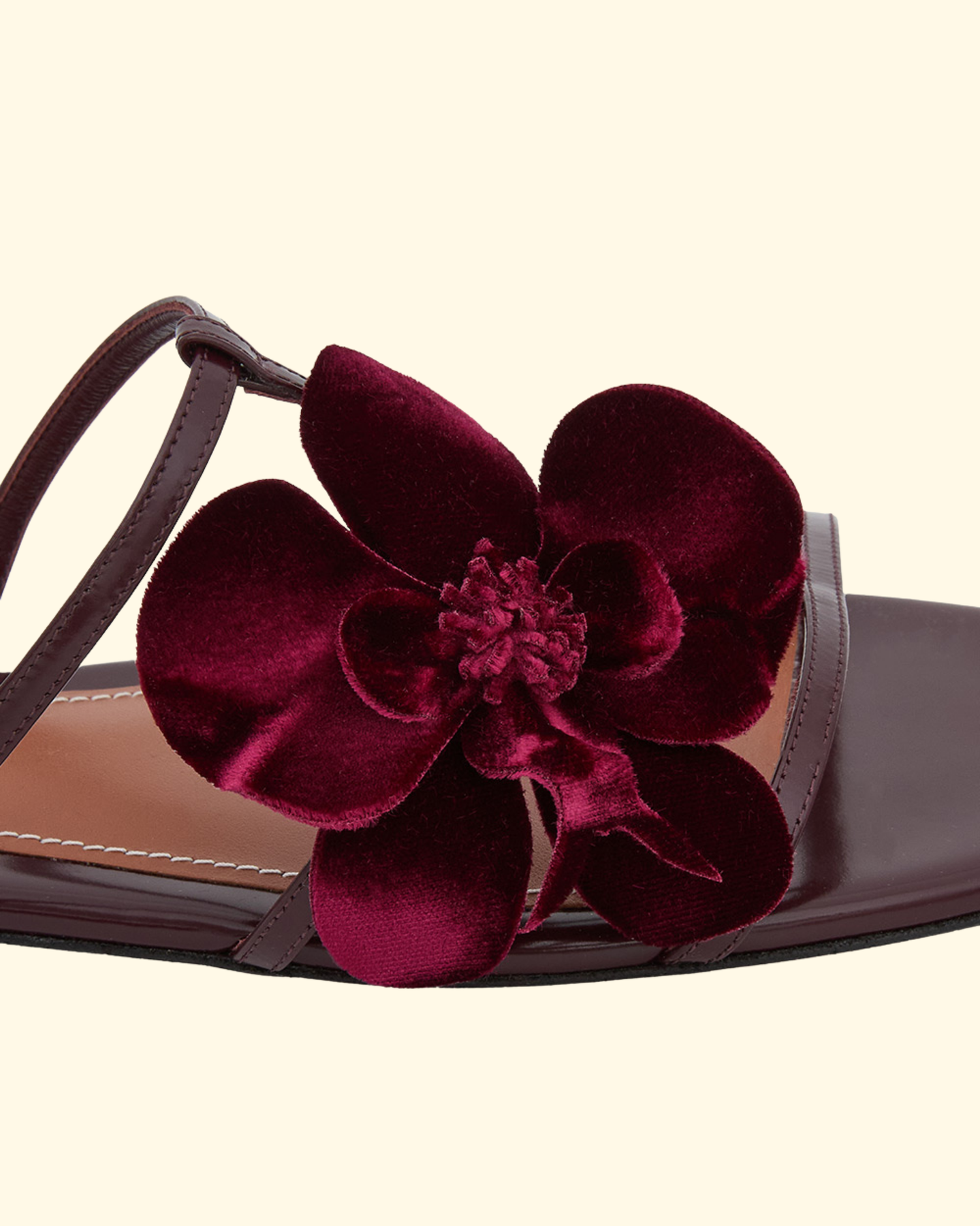 The Orchid Slide in Ruby from the Cruise 2026 Collection, Twisted Romance. Orchid adds effortless sophistication to any look with fine strapping and custom-moulded leather orchids. Spazzolato leather slide with velvet orchid and leather outsole, round toe and an asymmetric fixed orchid design. 5mm block heel. Made in Italy.