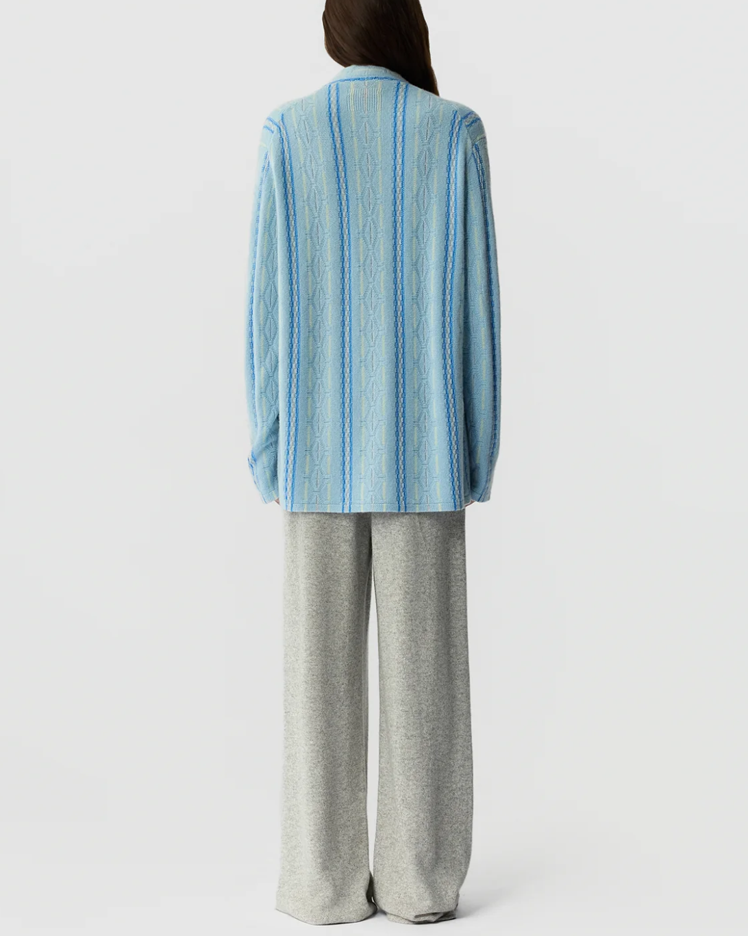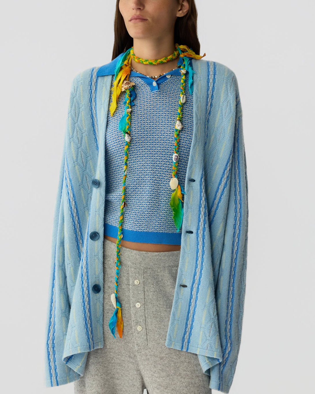 The Baja Everywear Cardigan is a unisex striped cardigan featuring our signature Everywear silhouette, updated with a four-color jacquard stripe and raised texture. This mid-weight knit cardigan is finished with a three-button front and relaxed shape, making it an effortless layer worn open or buttoned up.