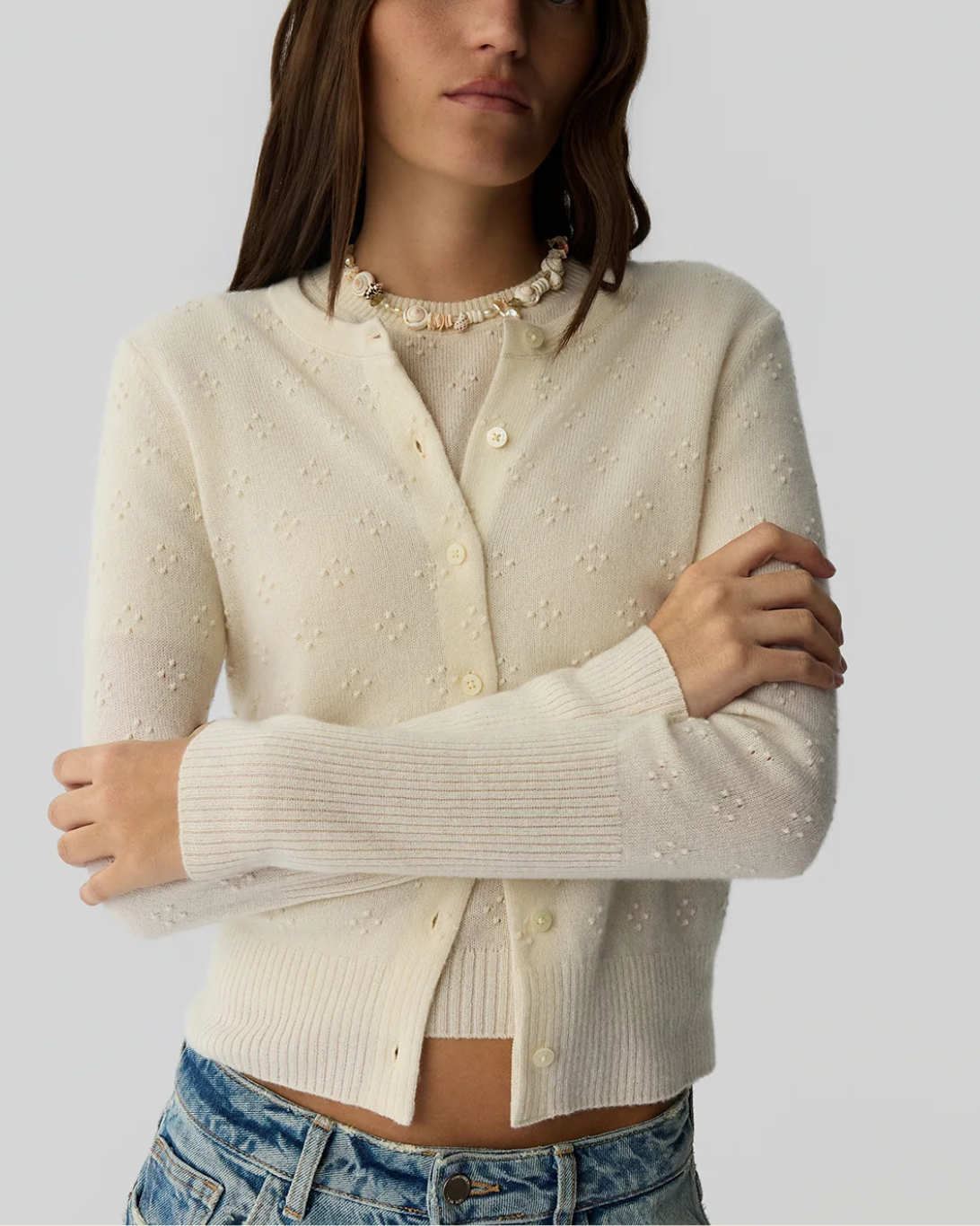 The Compass Jane Cardigan is a women’s light-weight cashmere cardigan knit from 100% cashmere with a soft popcorn stitch texture. Designed with a classic button-front closure and ribbed trims, this versatile cardigan offers effortless styling for transitional seasons.