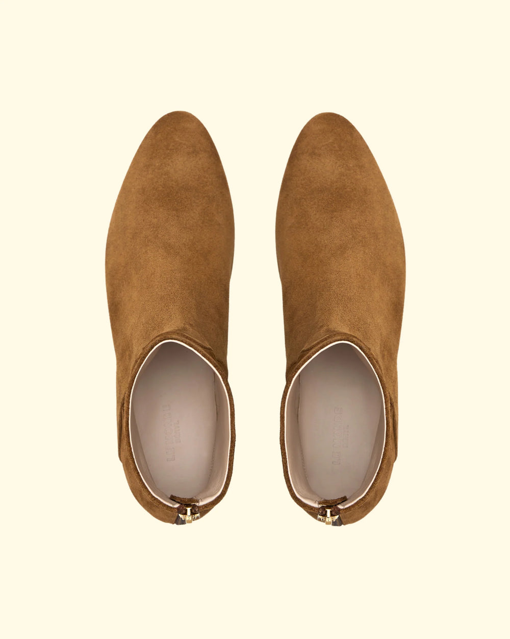 Allegra Chelsea Boot, handcrafted in taupe suede, with a cushioned calf leather insole, back zip fastening and leather piping. 40mm heel. Made in Italy.