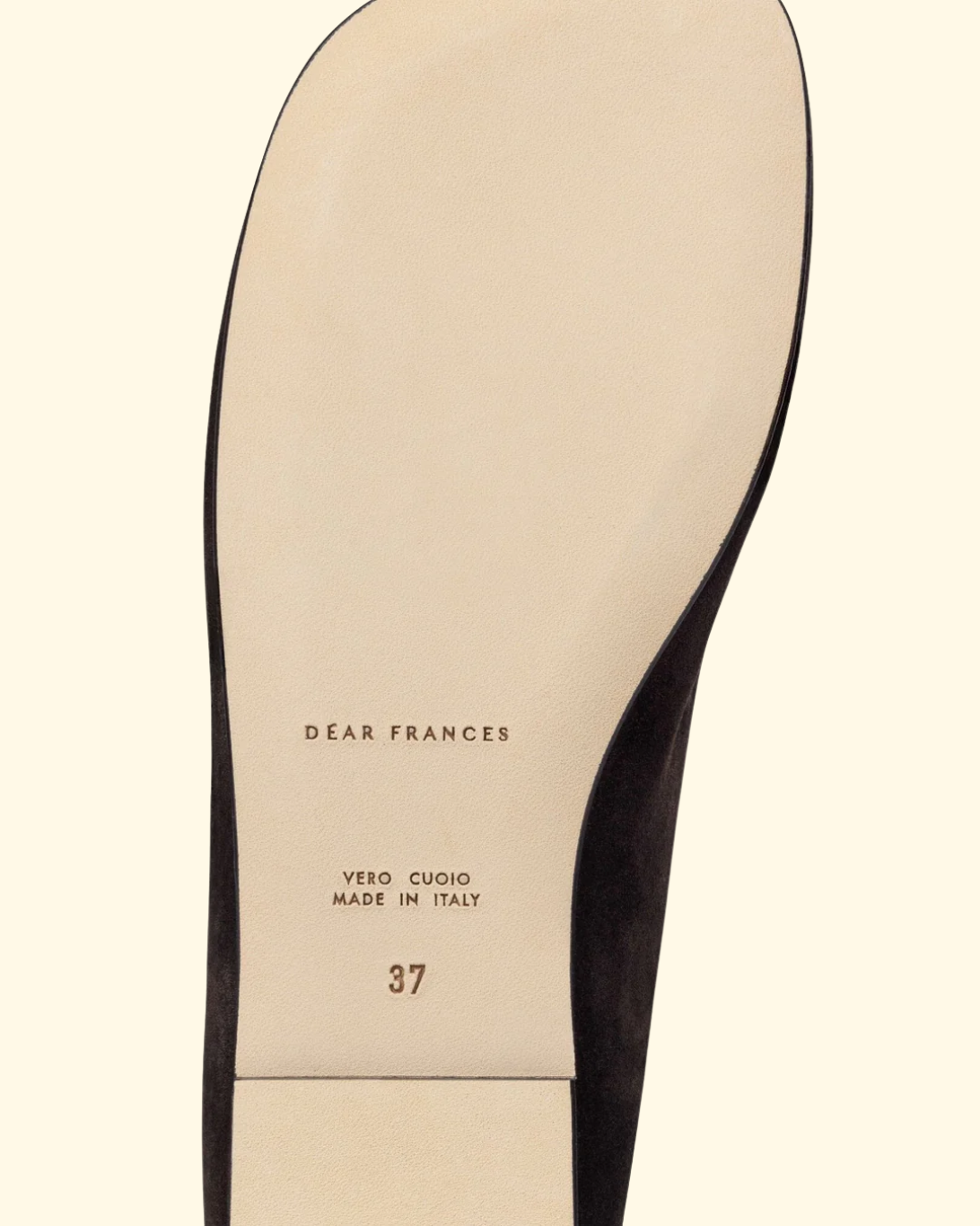 Suede with suede tassels and leather lining. Leather insole and outsole, with black painted edges and cuoio heel.