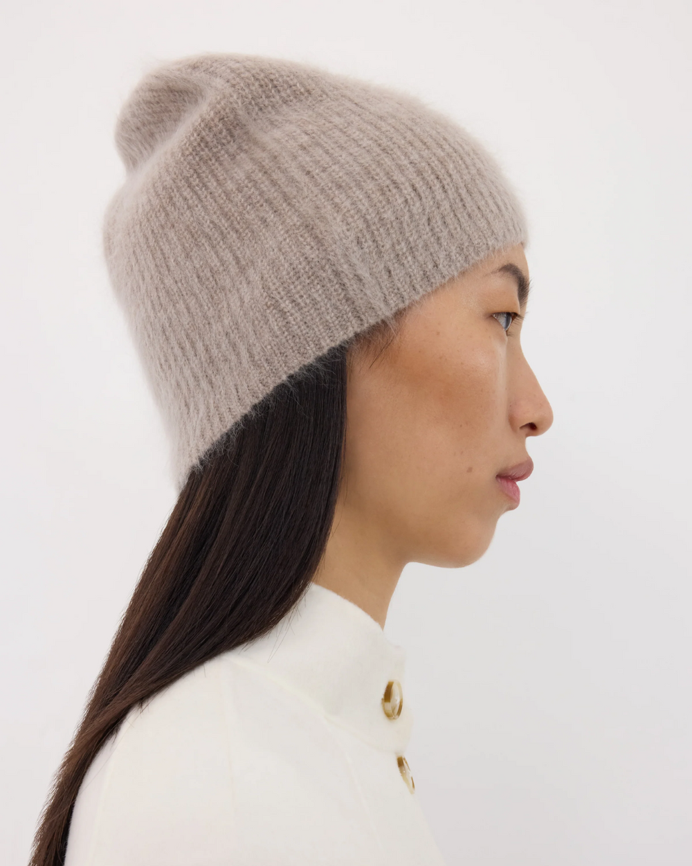 This beanie is crafted from pure cashmere for a luxurious, ultra-soft feel. Designed with a classic ribbed knit, it features a snug, comfortable fit that gently hugs the head while maintaining a minimalist, refined silhouette.