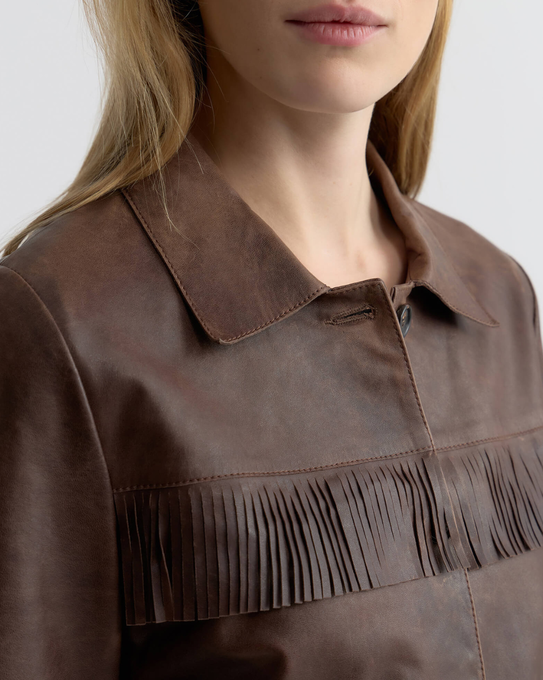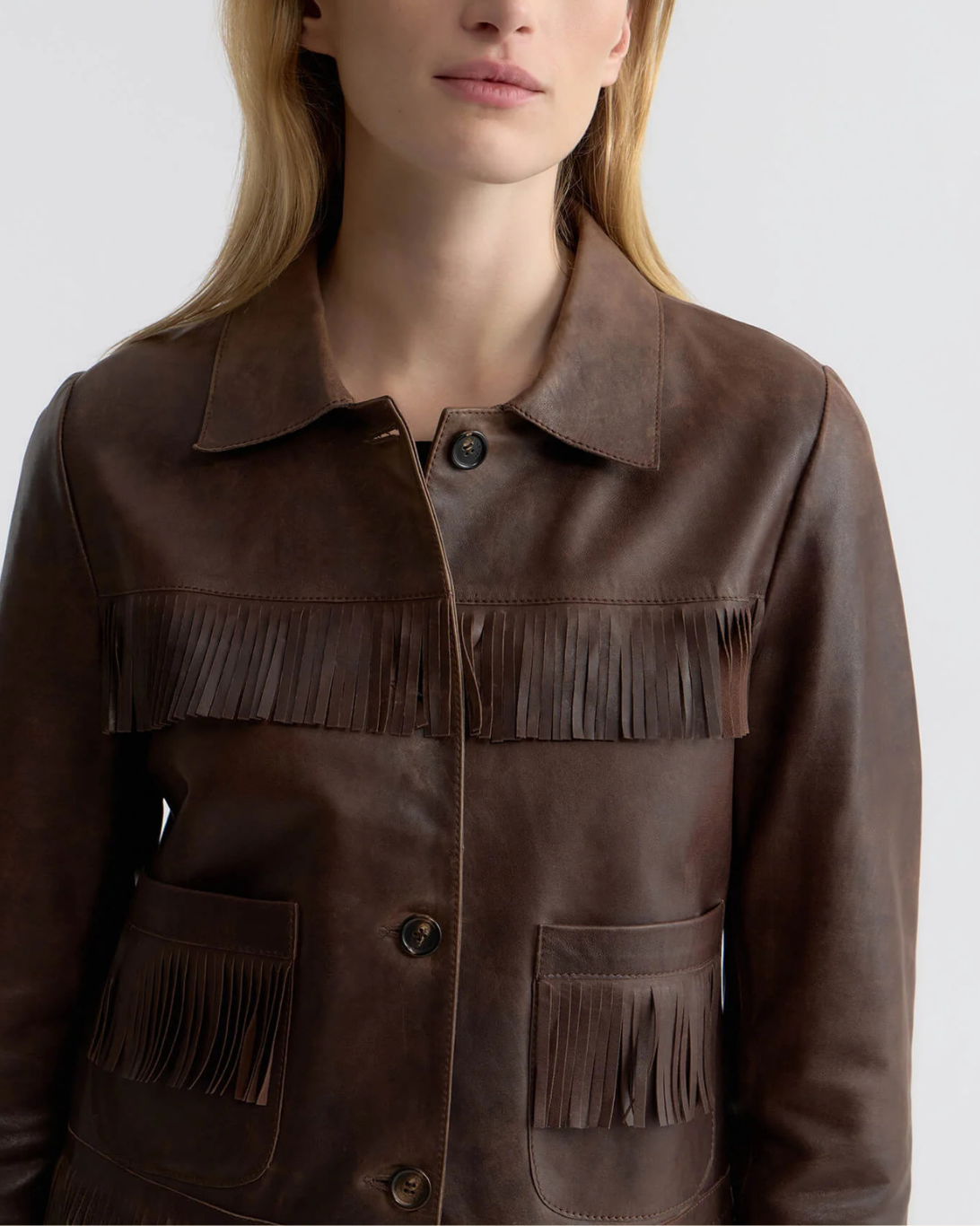 Shrunken, cropped jacket with fringe detailing at front and back yoke, pockets, and hem. Collared design with button front closure and bound buttonholes. Bracelet-length sleeves.