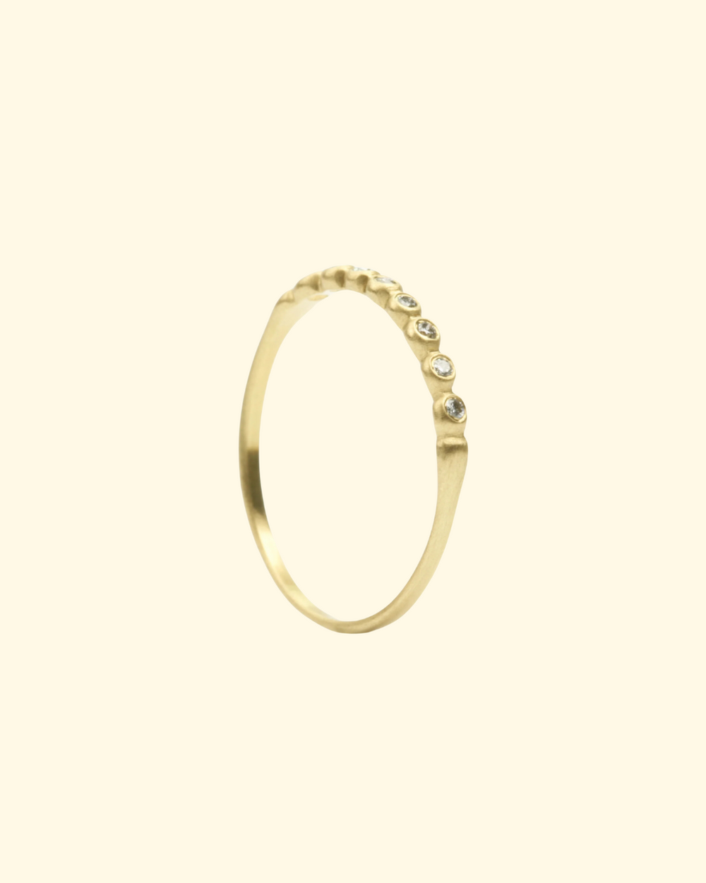 This sweet band is lovely and delicate when worn by itself and adds sparkle and texture to a stack. Originally designed to be worn as a simple wedding band, it quickly became one of Marian Maurer's best-sellers, both as a wedding and a stacking ring. Available in a variety of tapering widths, this one is 2.2 mm wide at its widest and features eight 1.25 mm diamonds. The approximate total diamond weight is 6 points, and the diamonds are G color, VS clarity. Using only recycled 18K gold,  the ring is finished to a rich satin matte