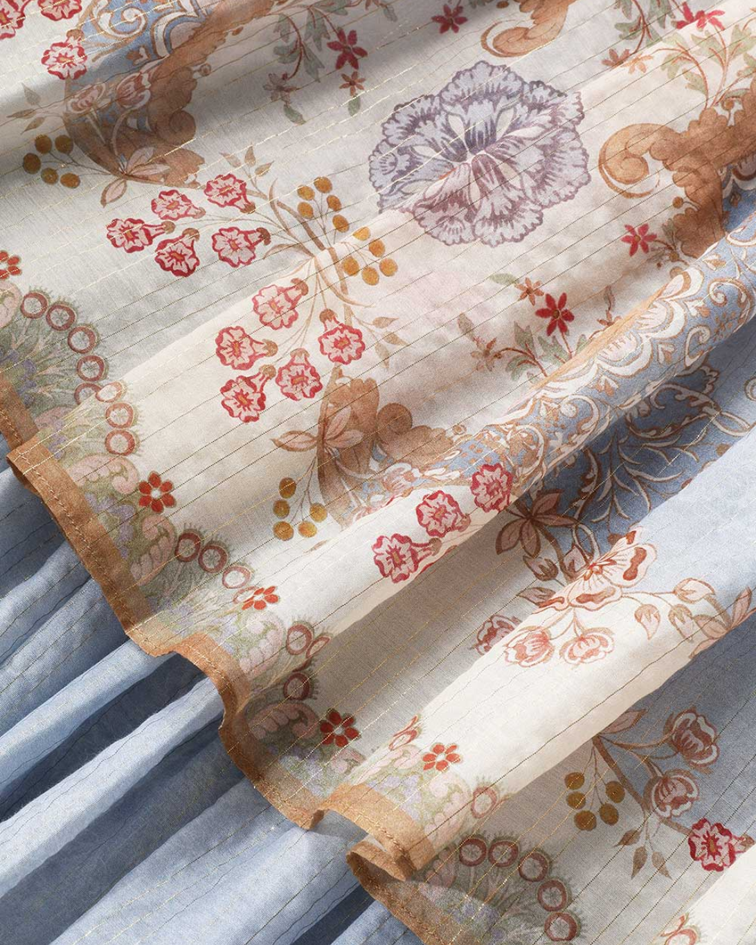 Main and bodice lining: 72% cotton, 25% silk, 3% metallised fibre; skirt lining: 100% cotton