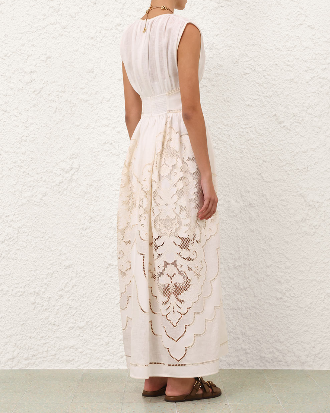 The Daylight Waisted Dress in Cream from our Resort Swim 2026 Collection. A linen maxi dress featuring a fixed waistband, heavy gathering at the bodice, finished with an invisible centre back zip closure.