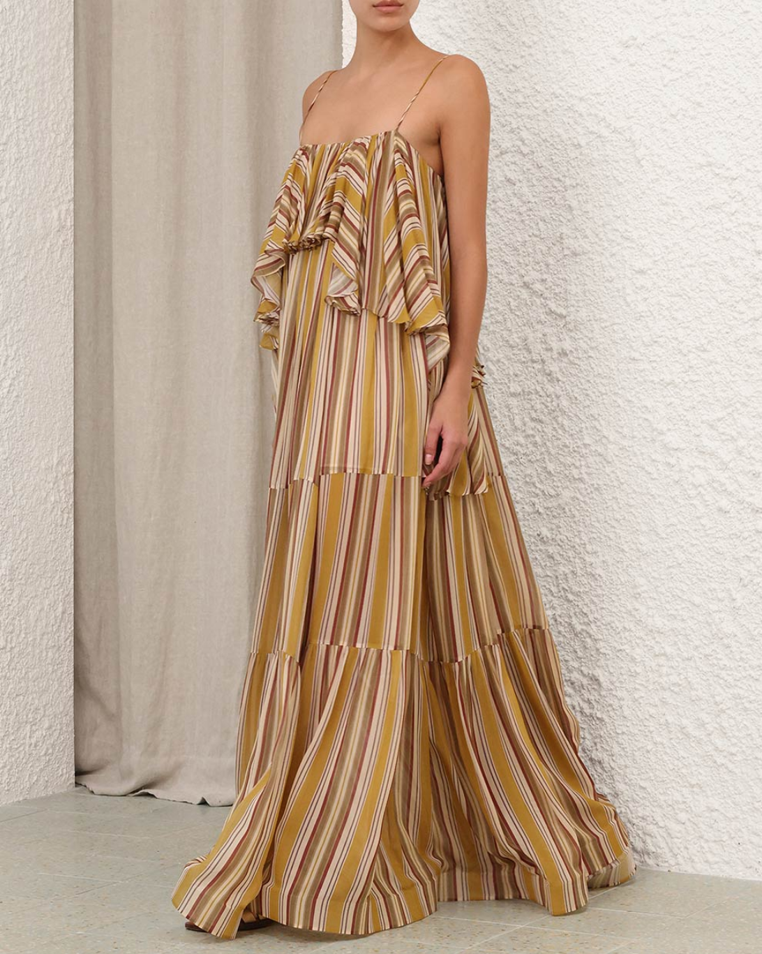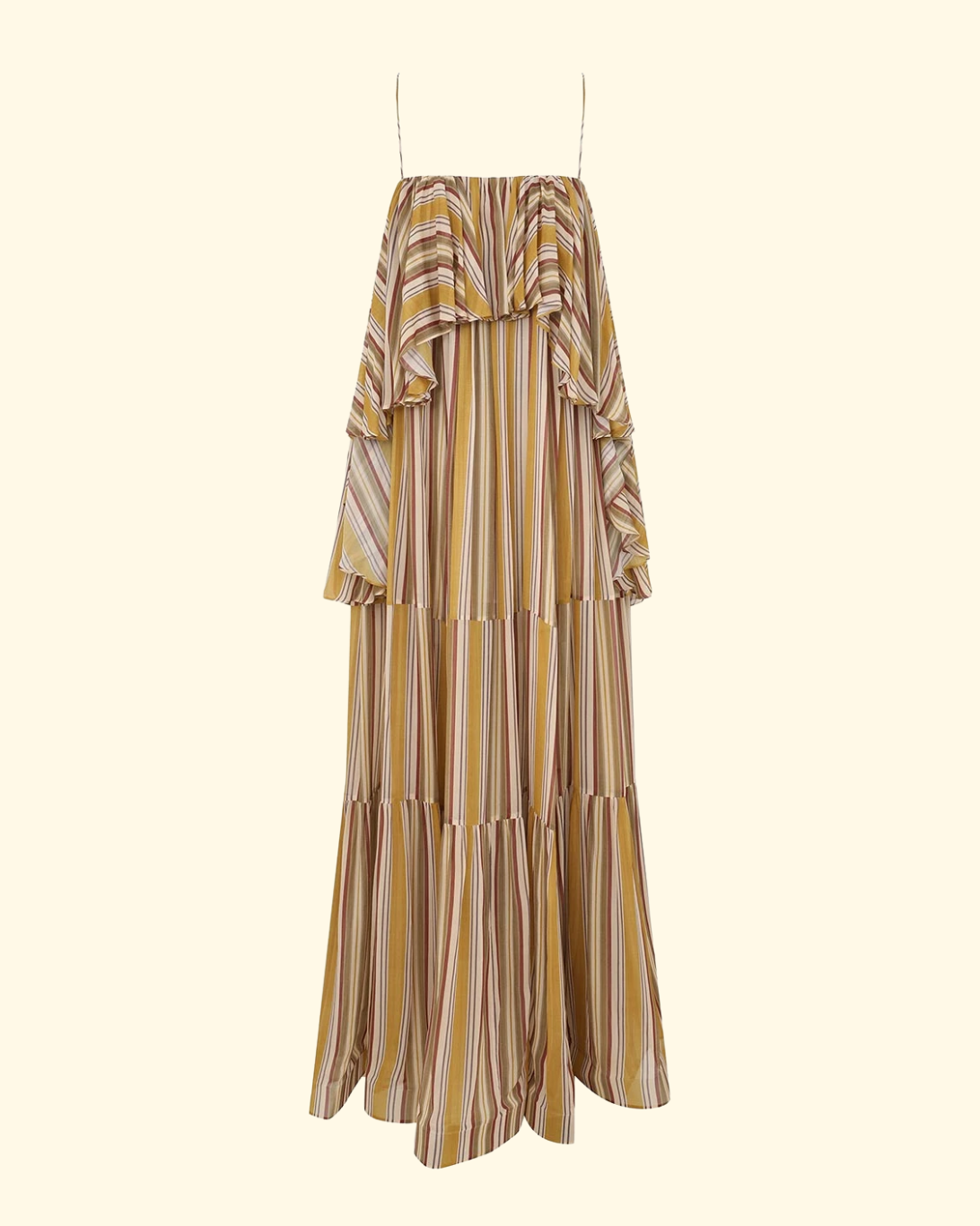 The Rebellion Bohemian Slip Dress in Mustard Stripe from our Cruise 2026 Collection, Twisted Romance. A tiered maxi dress featuring a square neckline, adjustable rouleau self-tie straps, heavy gathering throughout, and finished with a cascading ruffle overlay.